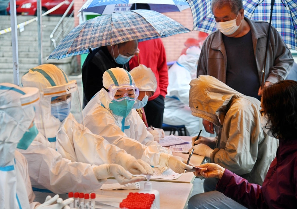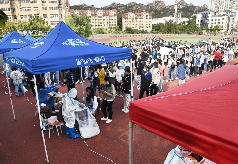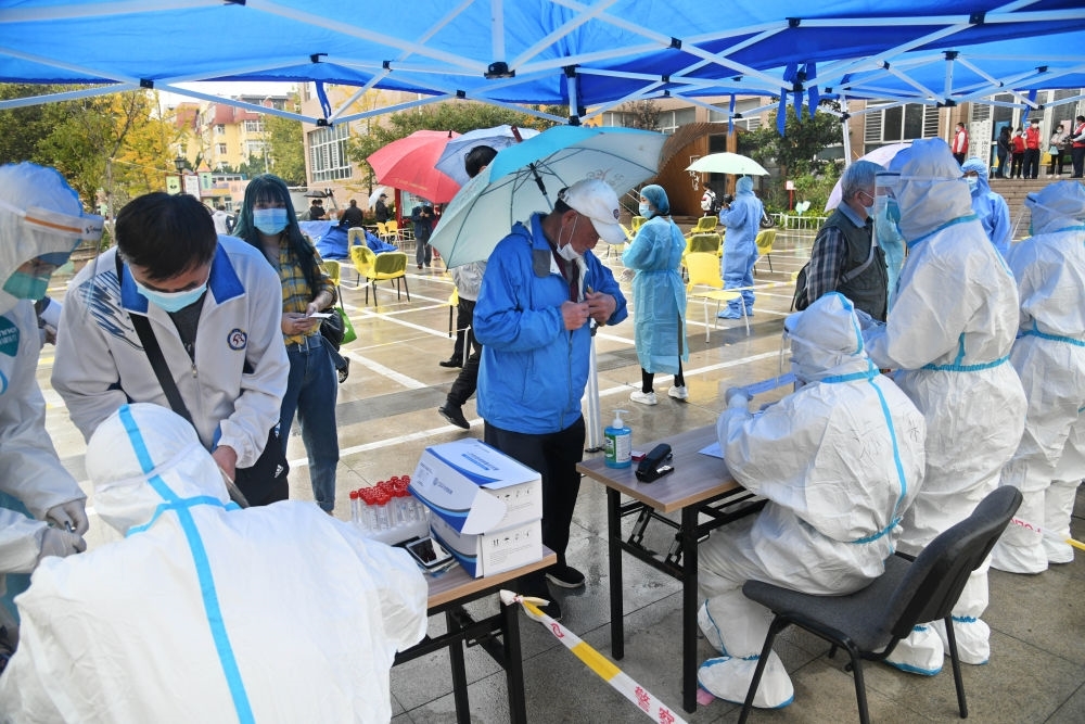 ↑10月13日,市民在青岛市市北区合肥路街道桦川路社区检测点进行核酸检测采样。