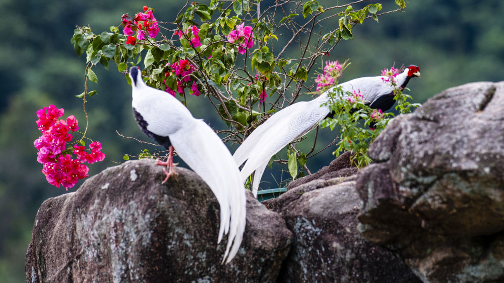 ↑10月14日,在南靖县鹅仙洞国家级自然保护区,两只白鹇在岩石上休憩。