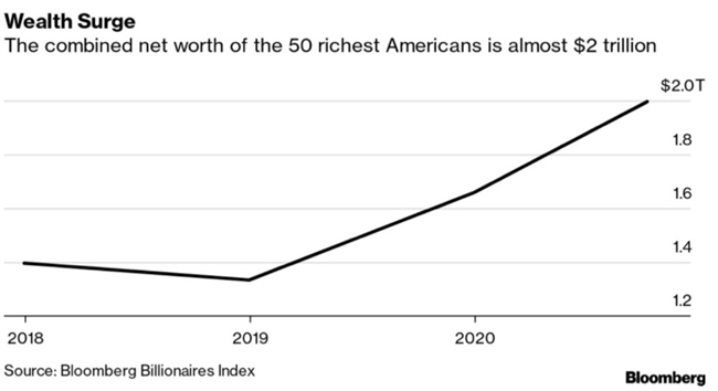 同时,根据彭博亿万富豪指数,美国50位最富有的人身家之和接近2万亿美元,较2020年初增长了3390亿美元。