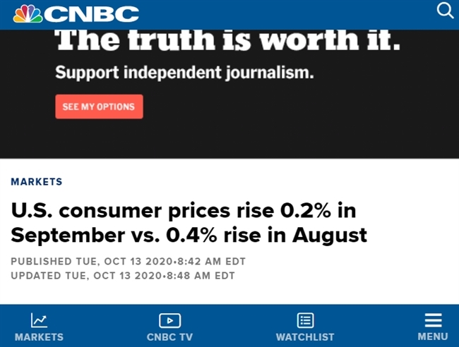 当地时间10月13日,美国劳工部发布数据显示,美国9月消费者价格指数(CPI)仅环比上涨0.2%,低于8月的0.4%,自6月以来持续回落,表明在经济复苏疲软的背景下,通胀持续低迷。与此同时,一项针对经济学家的最新调查显示,在新冠疫情反弹、纾困措施和美国大选面临不确定性的情况下,美国劳动力市场面临旷日持久的复苏,这意味着通胀压力较小的美联储将在相当长的一段时间内维持超低利率水平。