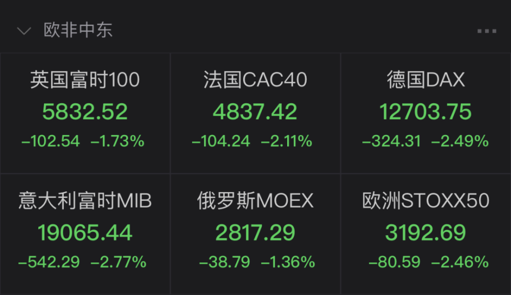 截至当日收盘,欧洲主要股指跌幅较盘中最高时收窄。Wind数据显示,衡量欧洲股市整体表现的欧洲斯托克50指数下跌2.46%,报3192.69点;德国DAX指数下跌2.49%,报12703.75点;英国富时100指数下跌1.73%,报5832.52点;法国CAC 40指数下跌2.11%,报4837.42点。
