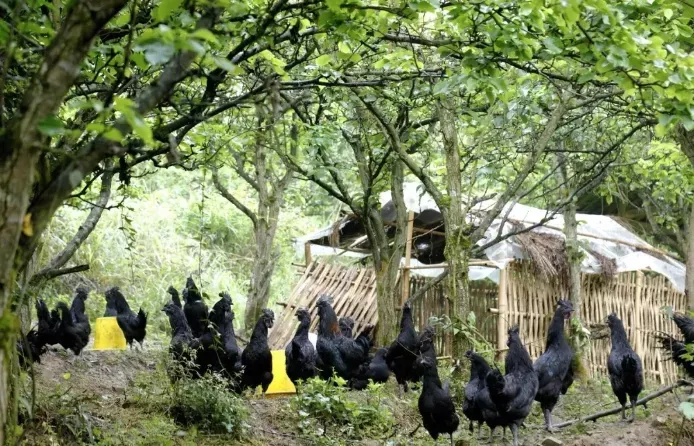 蒙蒙细雨、山间绿竹,一群“身强体壮”的鸡,有的在散步,有的在追逐。蓝色鸡棚里,一批刚采购的鸡苗,还在“闲庭信步”,时不时地窥探一下外面的世界。