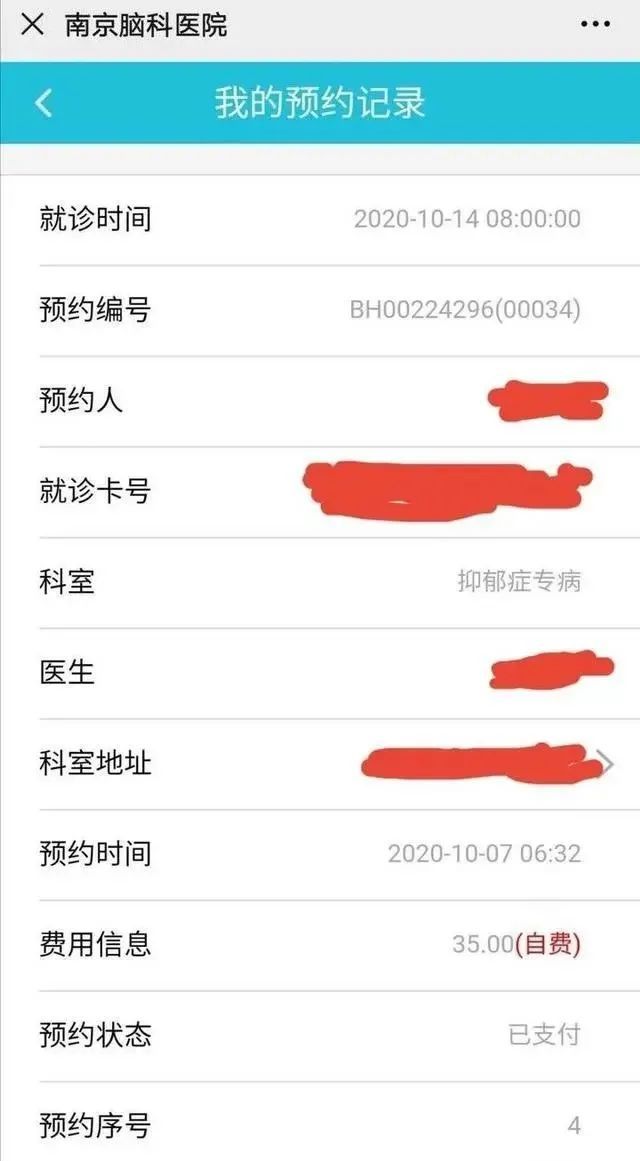 △于先生女友的就诊预约记录,科室为抑郁症专病。(图为于先生提供)