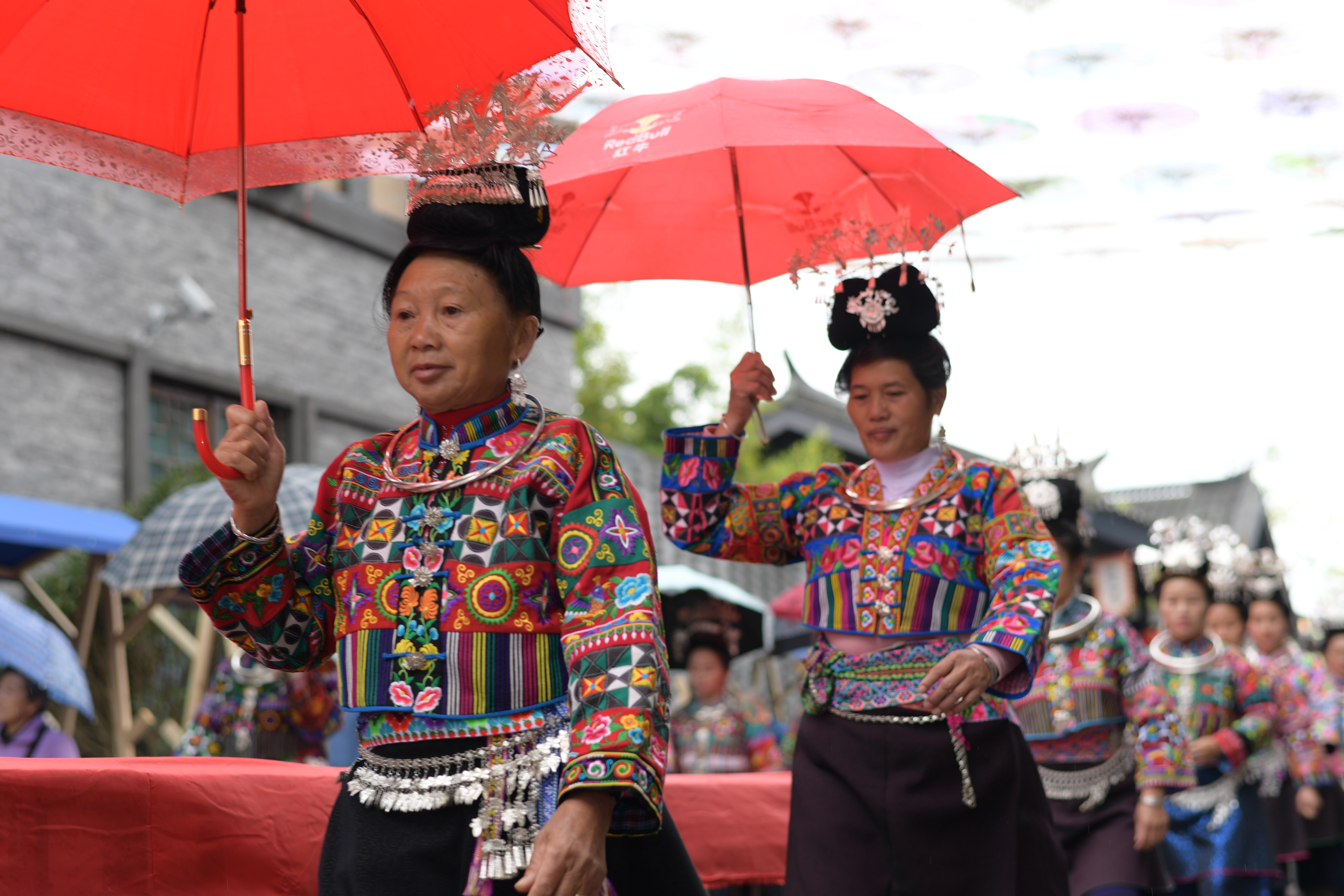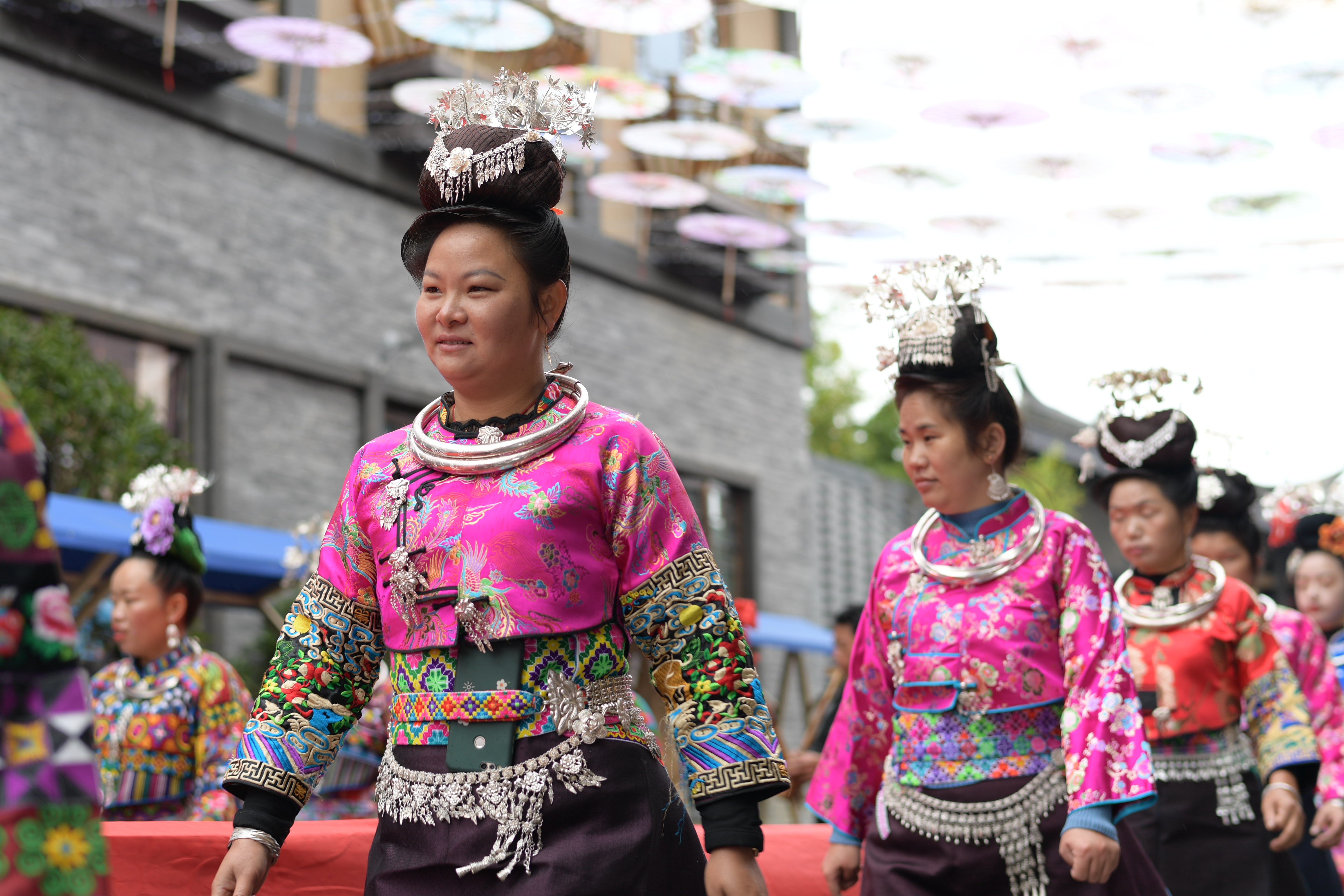 ↑10月17日,身着盛装的苗族群众在贵州省黔东南苗族侗族自治州丹寨县万达小镇参加服饰巡游。新华社记者 杨楹 摄