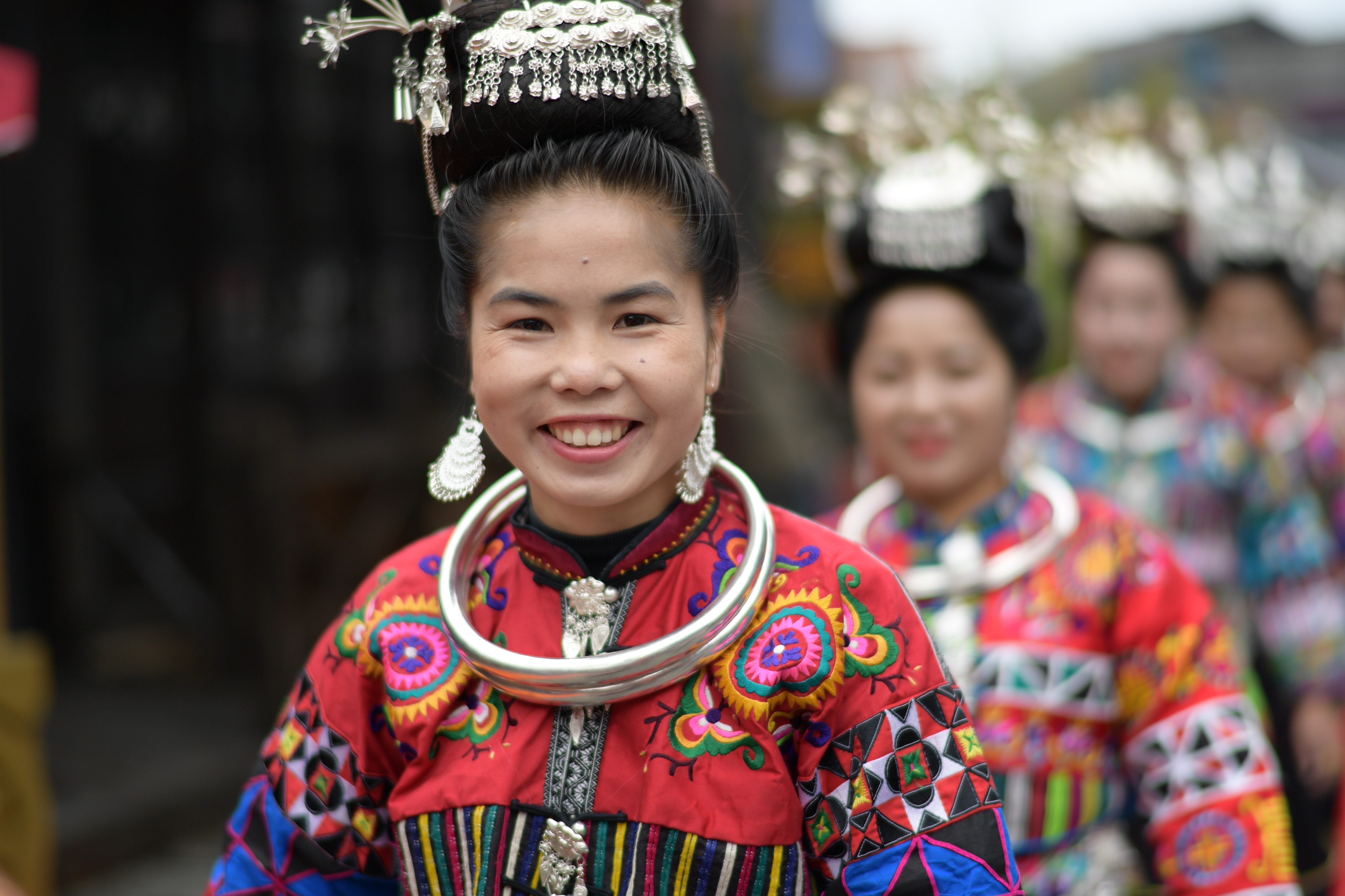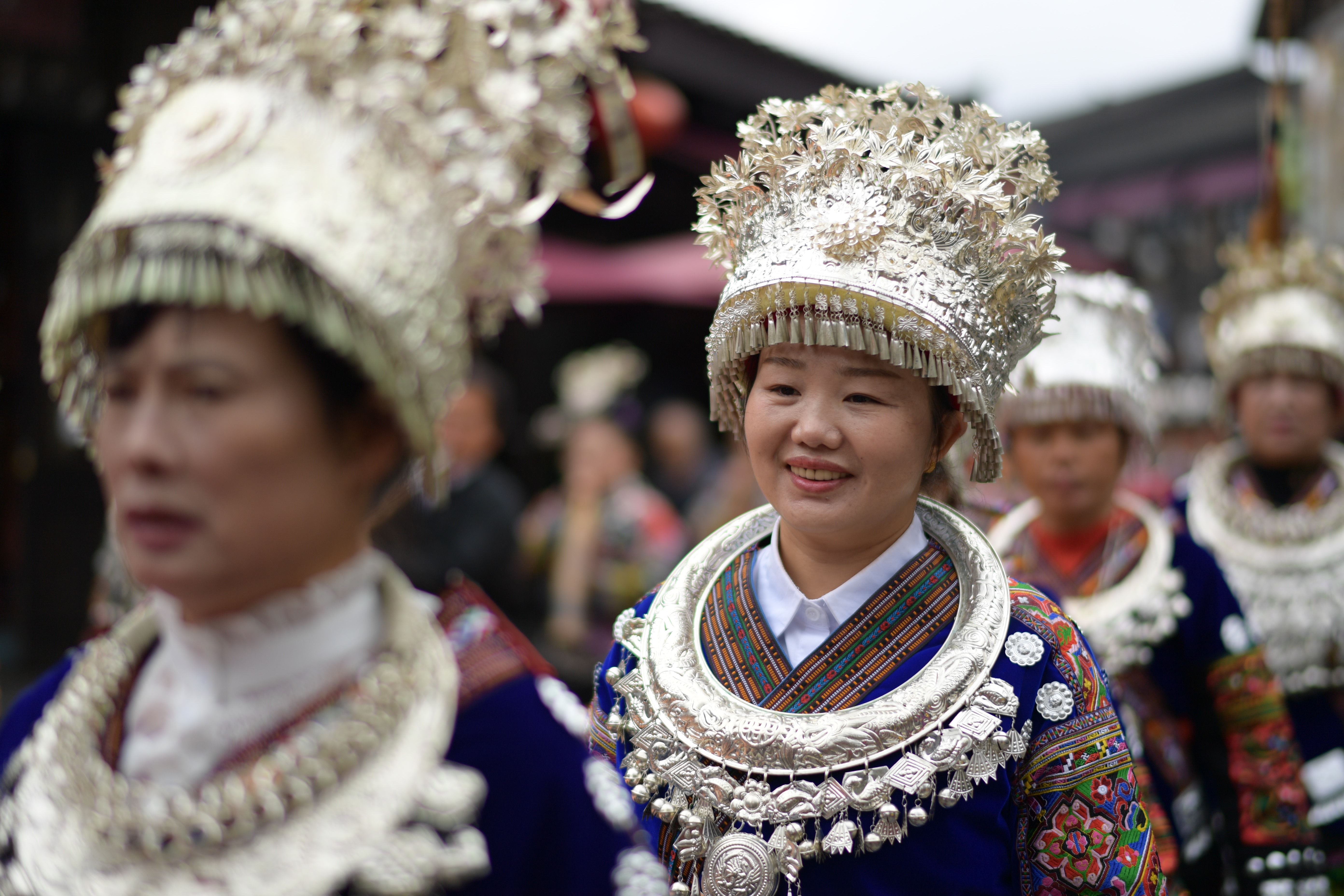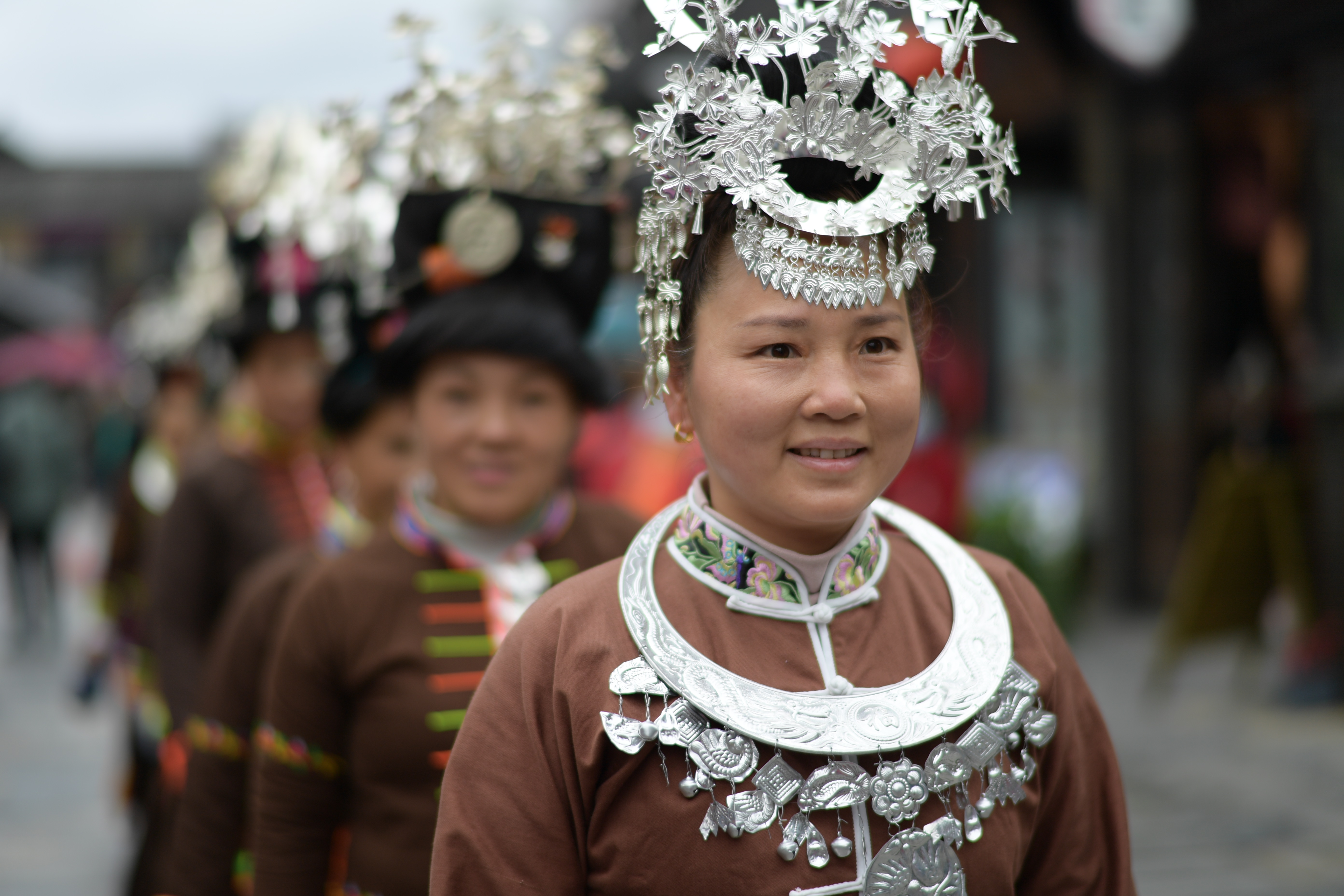 在贵州省黔东南苗族侗族自治州丹寨县万达小镇景区,当地苗族群众每逢周末及节假日,都会穿上传统节日盛装,集中展示当地多个支系、不同风格的苗族传统服饰,让游客大饱眼福。丹寨县苗族“嘎闹”支系服饰入选第二批国家级非物质文化遗产名录。