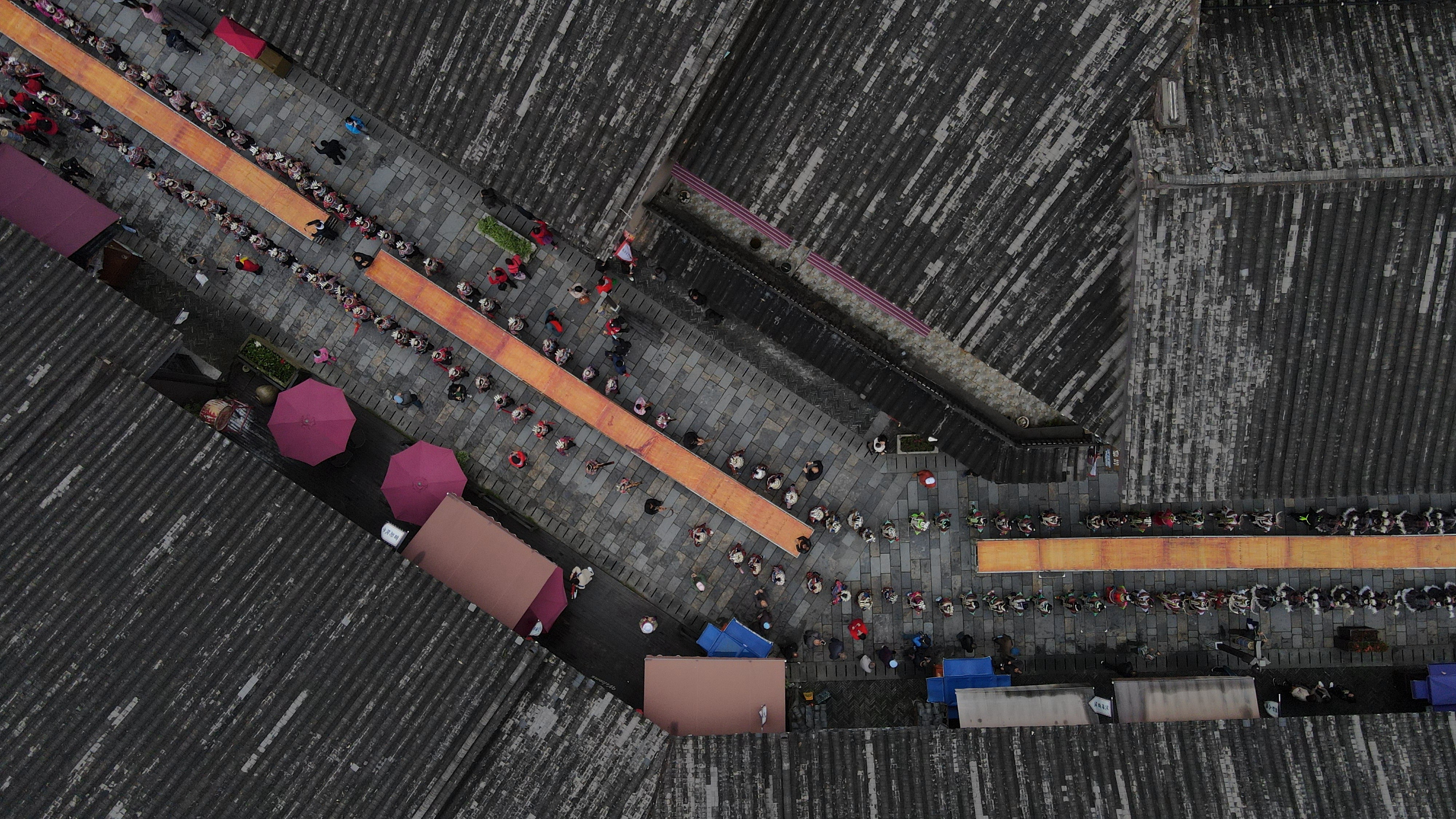 ↑10月17日,身着盛装的苗族群众在贵州省黔东南苗族侗族自治州丹寨县万达小镇参加服饰巡游(无人机照片)。