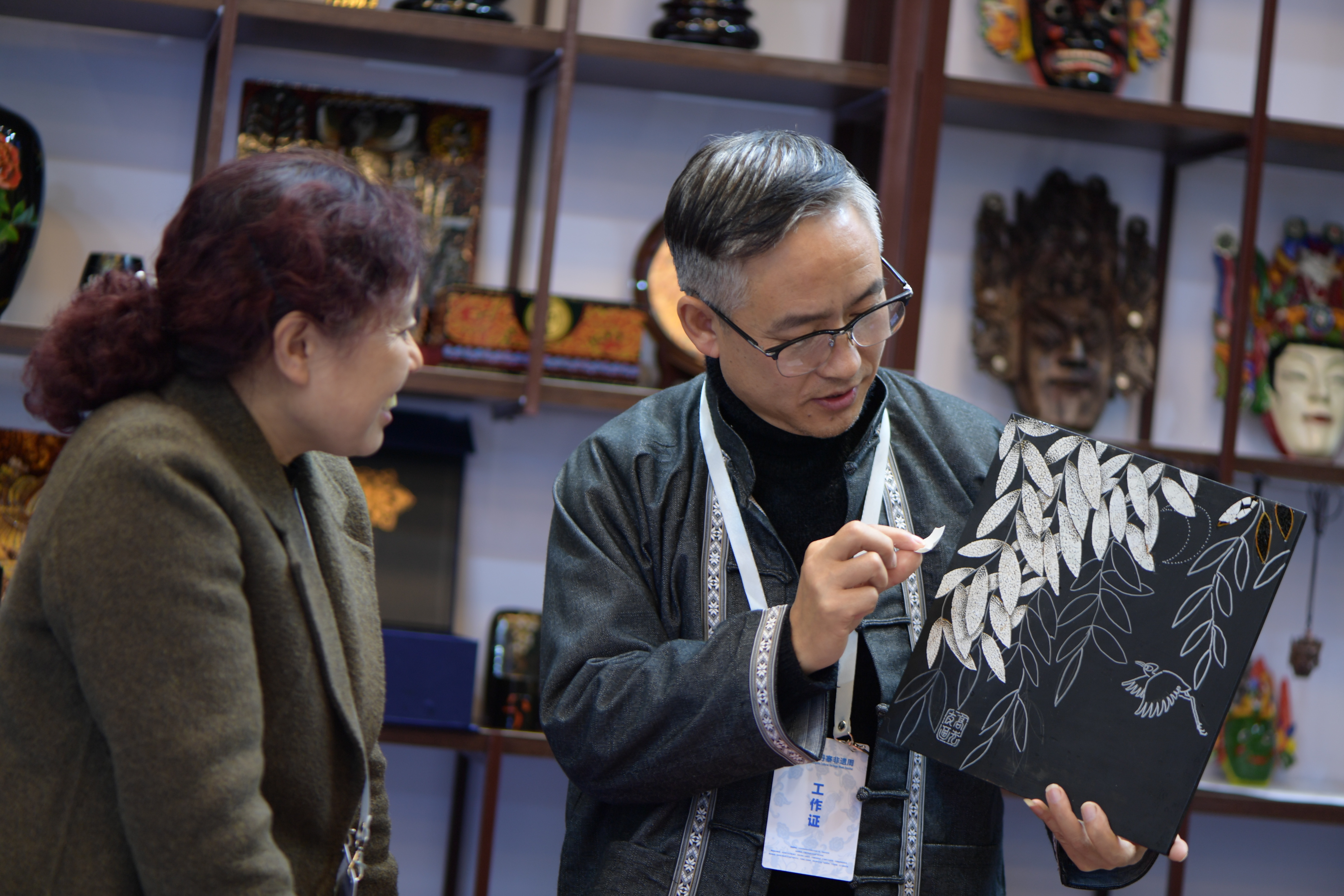 ↑10月17日,在贵州省丹寨县万达小镇非遗展示馆,非遗传承人高光友(右)在展示非遗工艺作品“蛋壳画”。新华社记者 杨楹 摄
