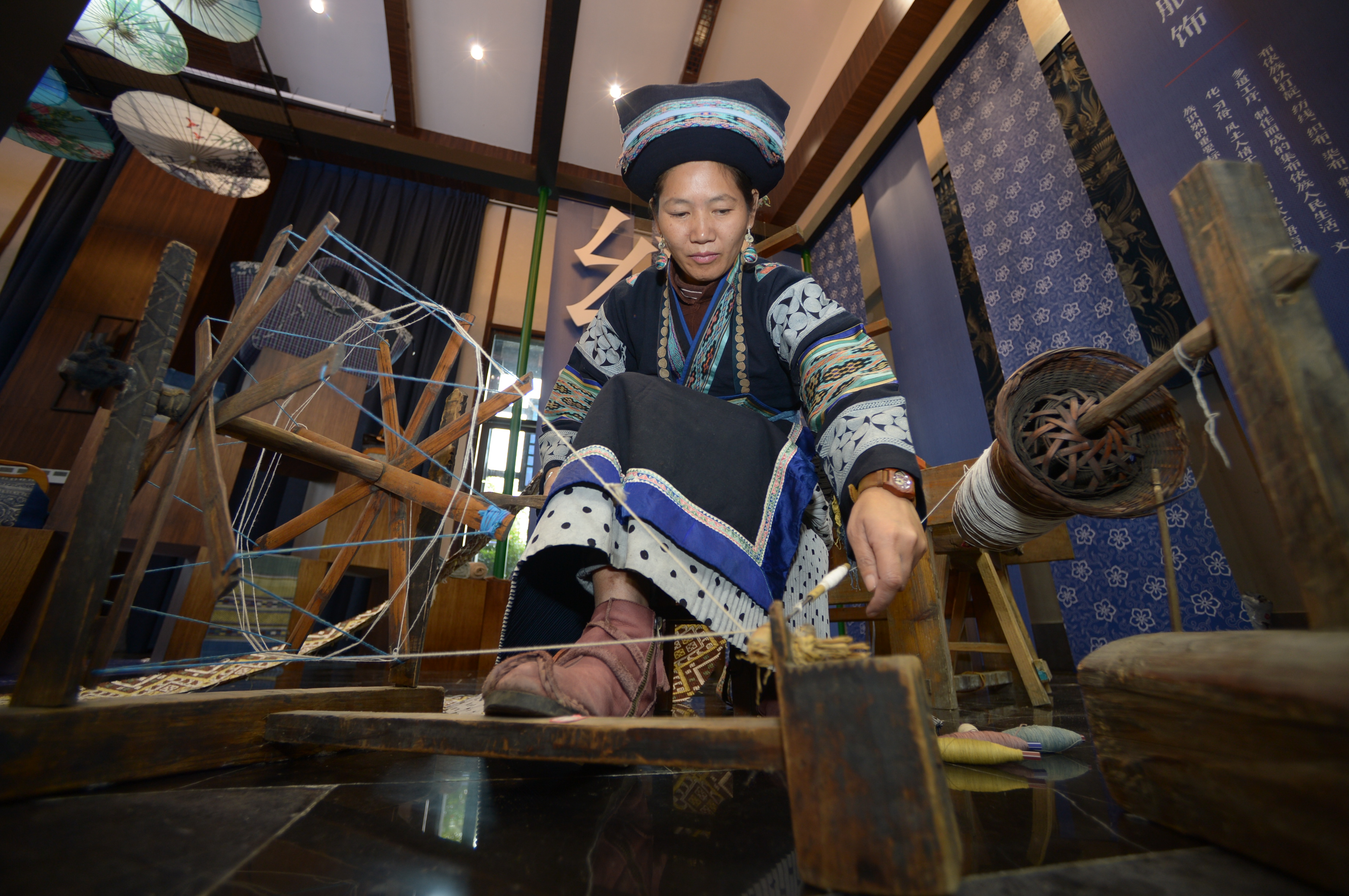 ↑10月17日,在贵州省丹寨县万达小镇非遗展示馆,非遗传承人在展示布依族服饰的制作过程。新华社记者 杨楹 摄