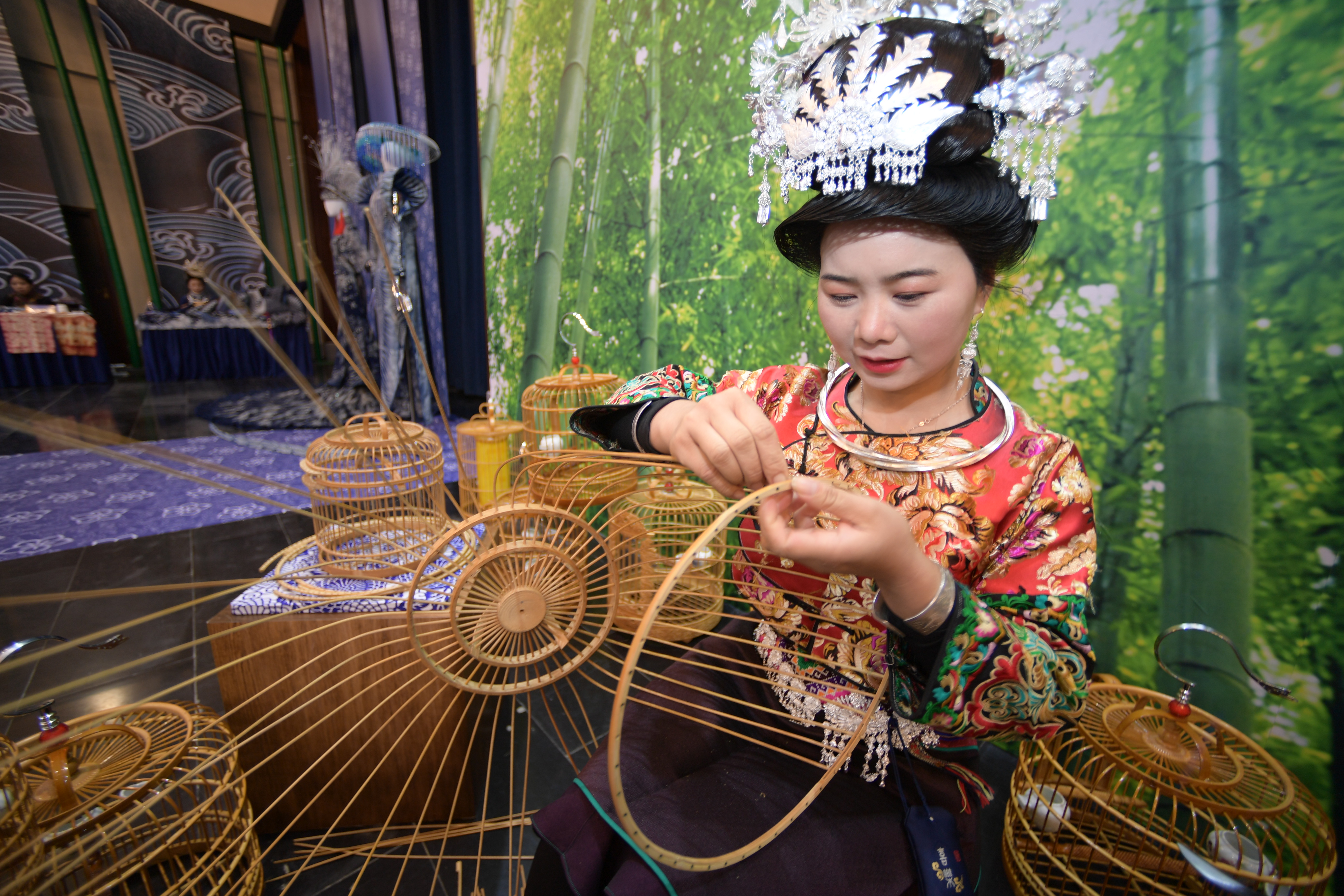 ↑10月17日,在贵州省丹寨县万达小镇非遗展示馆,非遗传承人在展示鸟笼制作技艺。新华社发(黄晓海 摄)