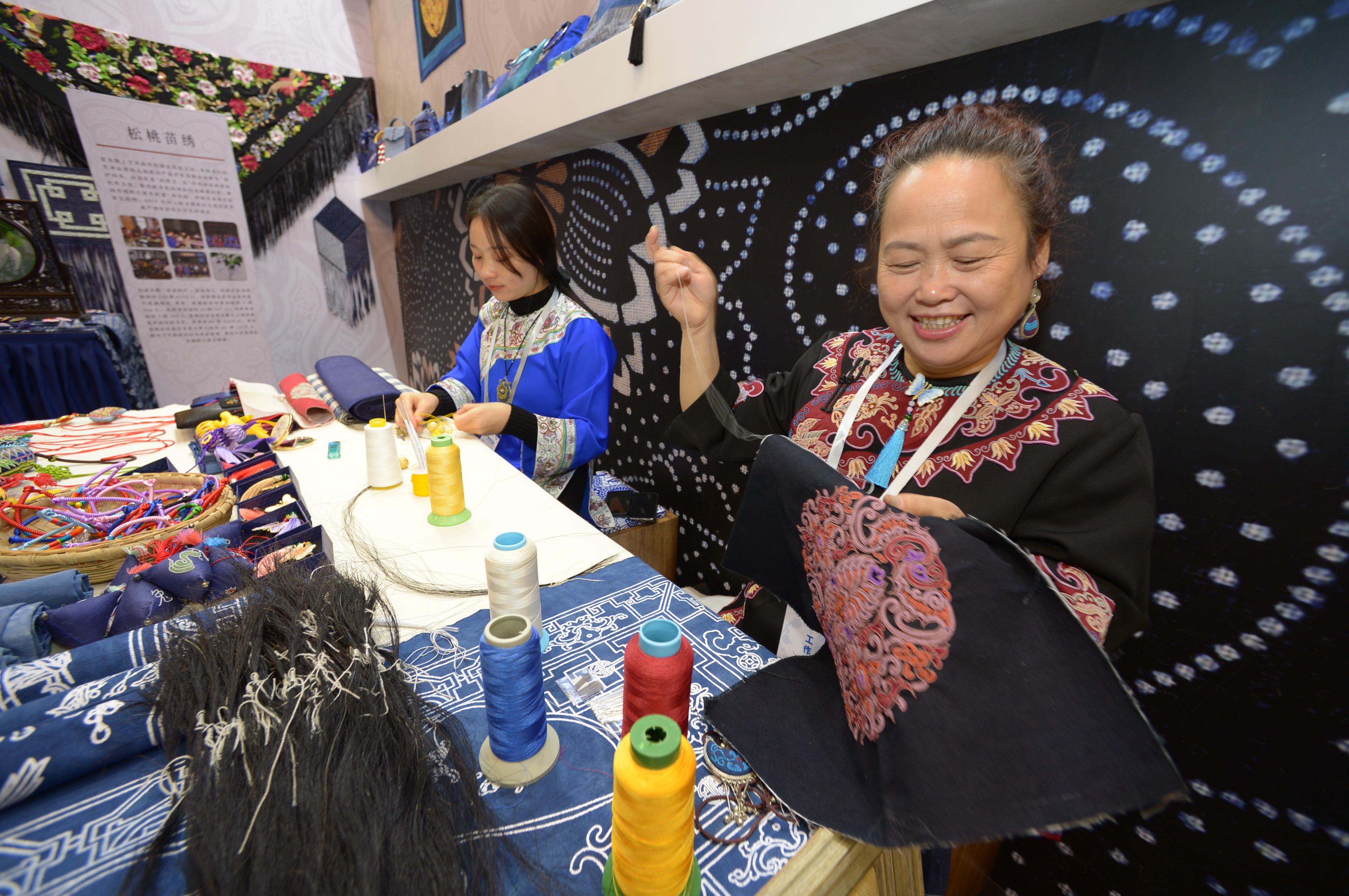 ↑10月17日,在贵州省丹寨县万达小镇非遗展示馆,非遗传承人在展示“水族马尾绣”技艺。新华社记者 杨楹 摄
