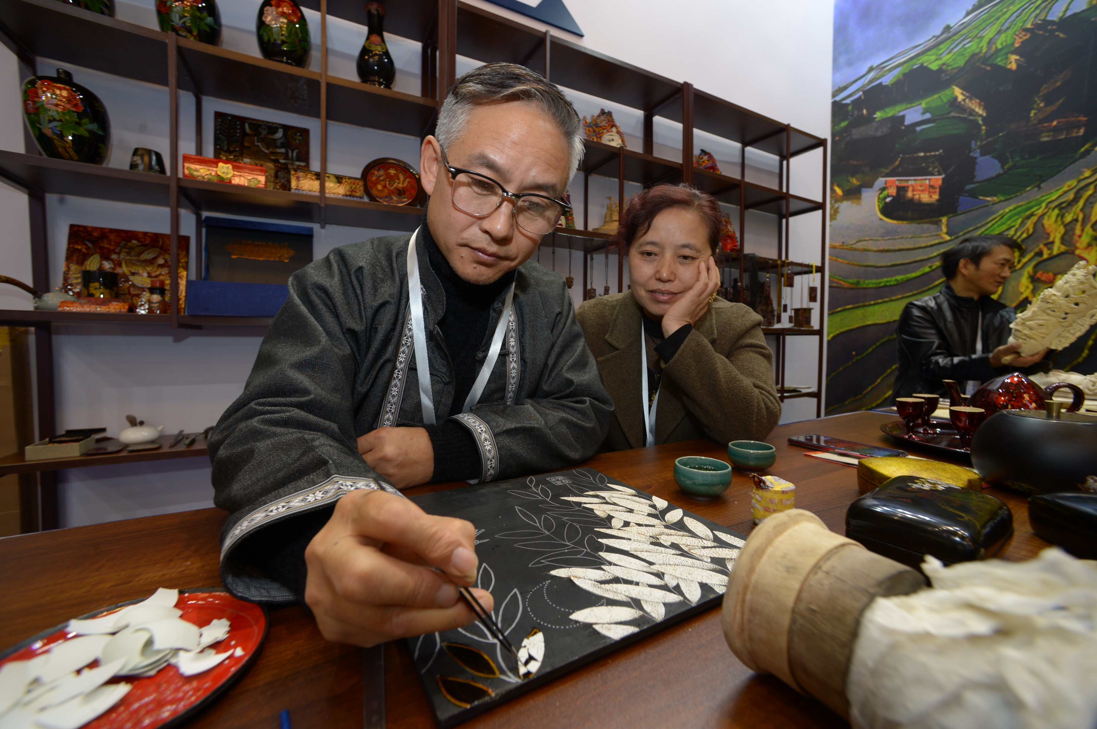 ↑10月17日,在贵州省丹寨县万达小镇非遗展示馆,非遗传承人高光友(左)在展示“蛋壳画”的制作技艺。新华社记者 杨楹 摄