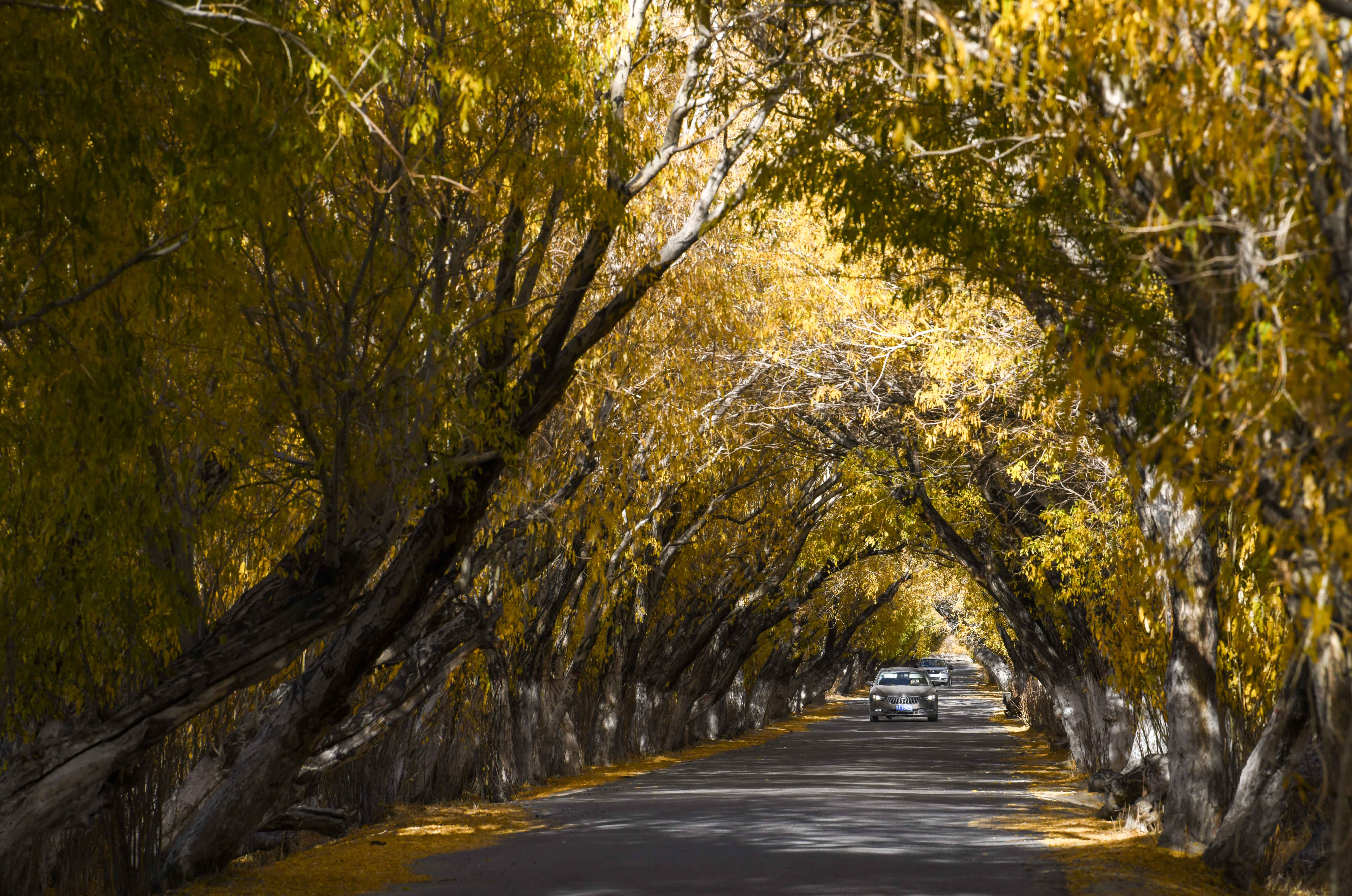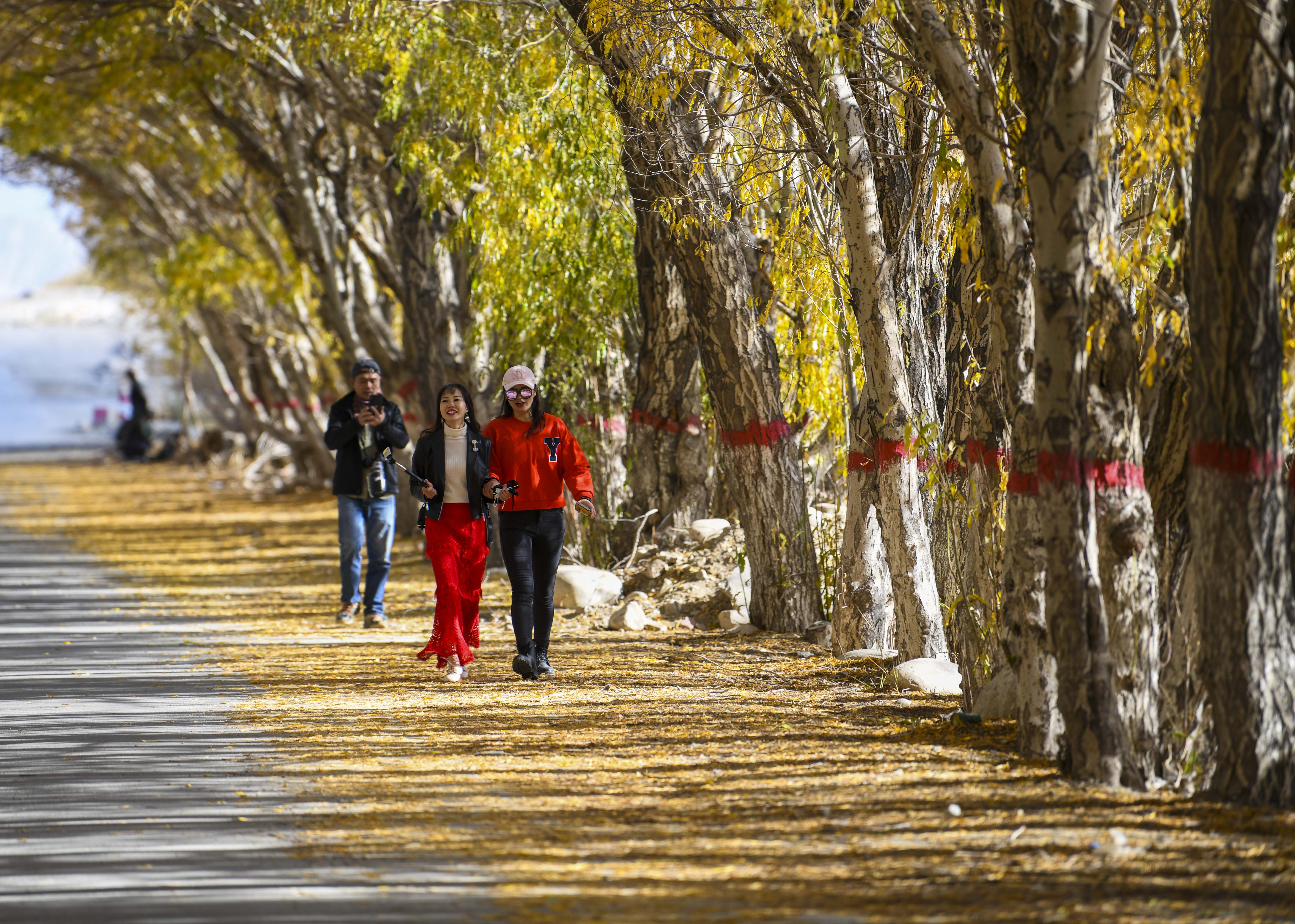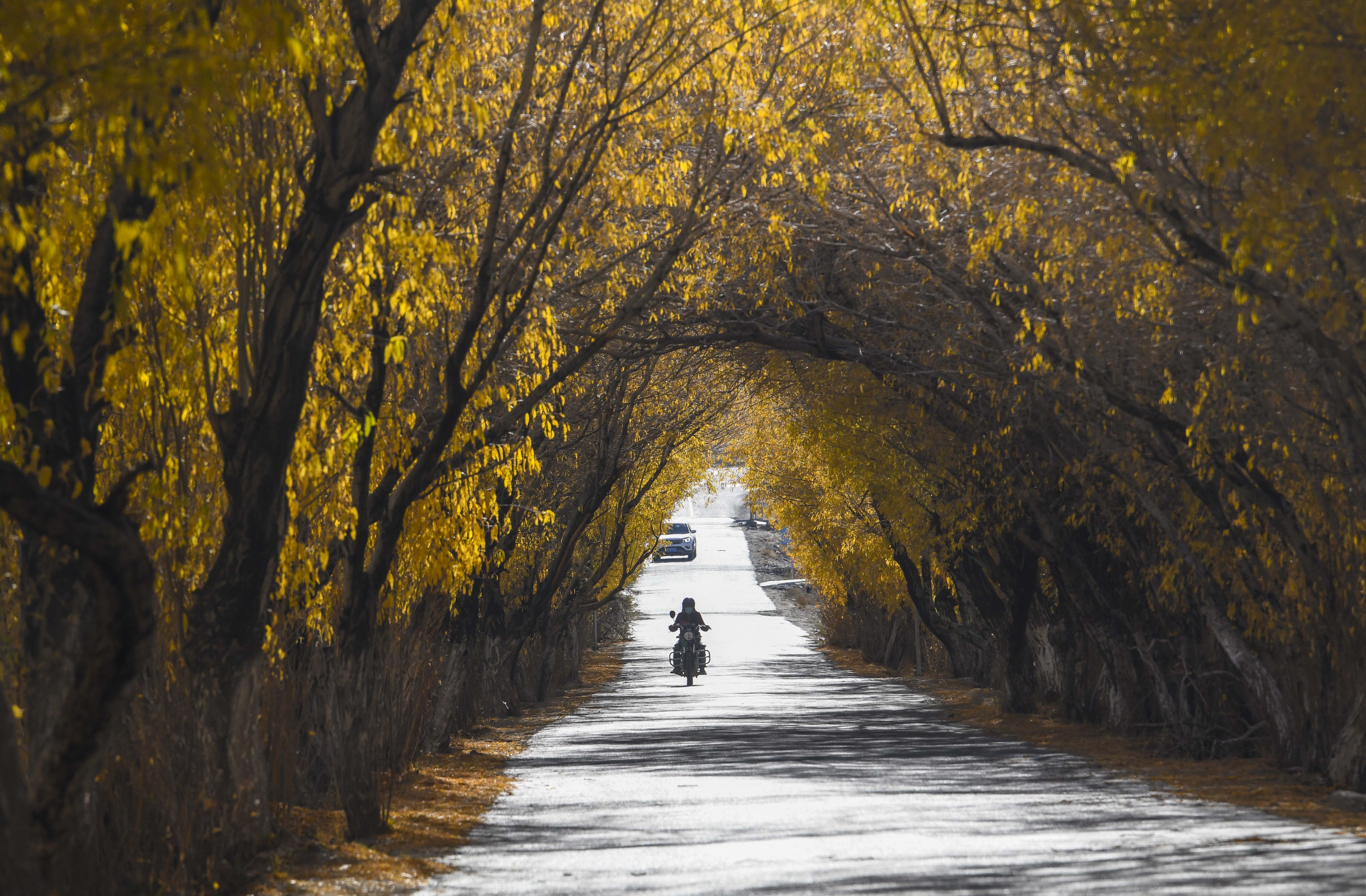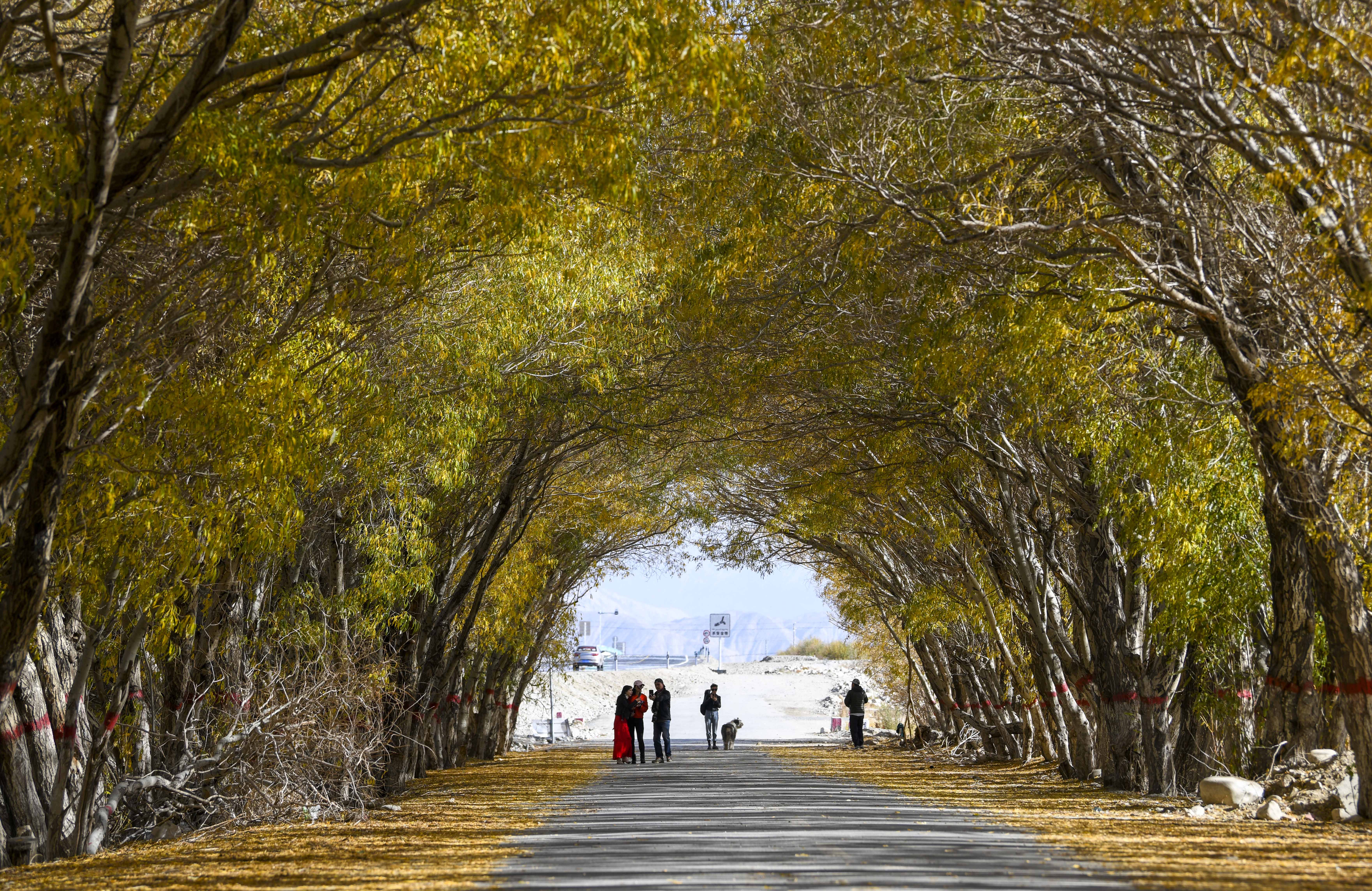 10月16日,在新疆塔什库尔干塔吉克自治县一处乡间道路上,游客在欣赏秋景。