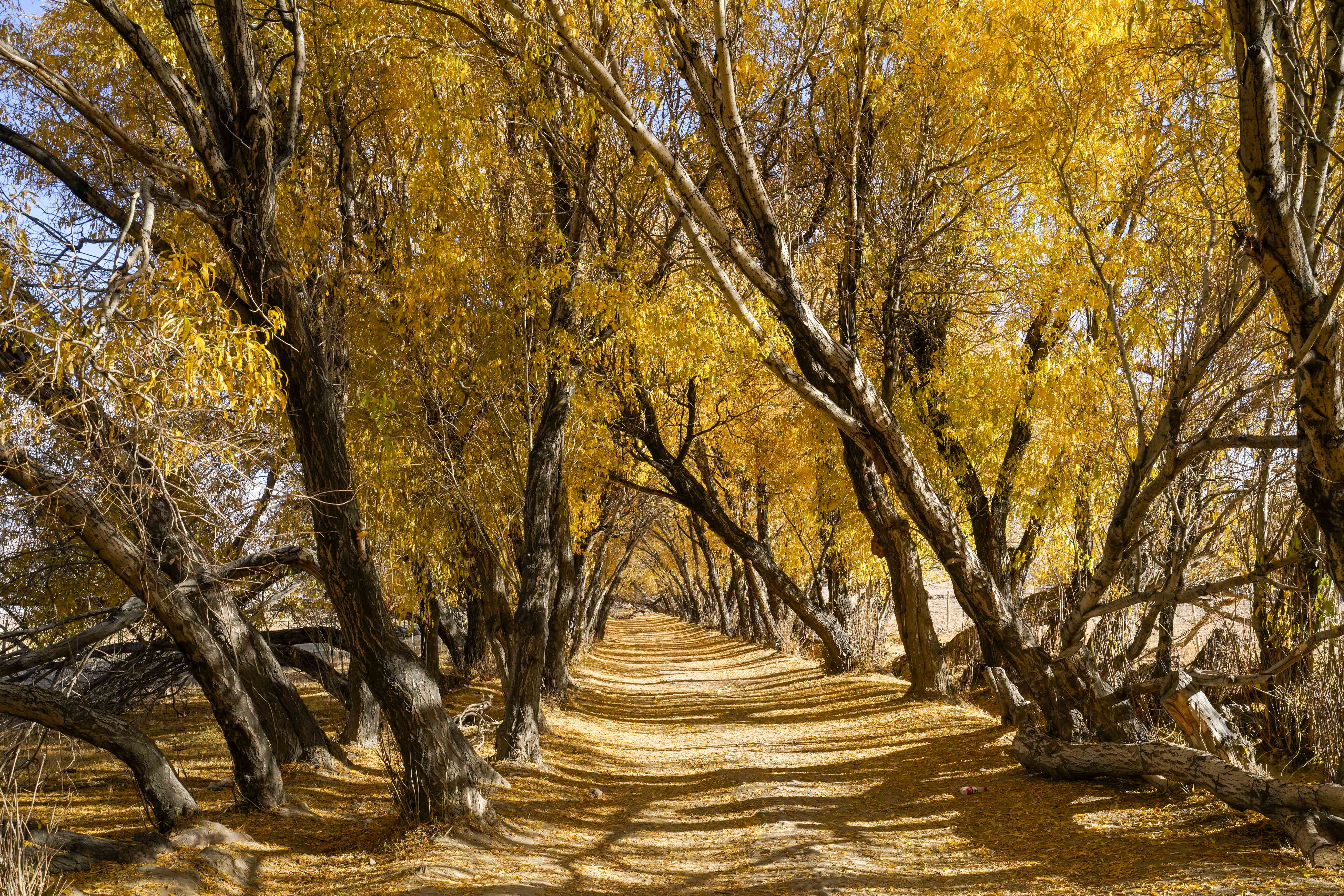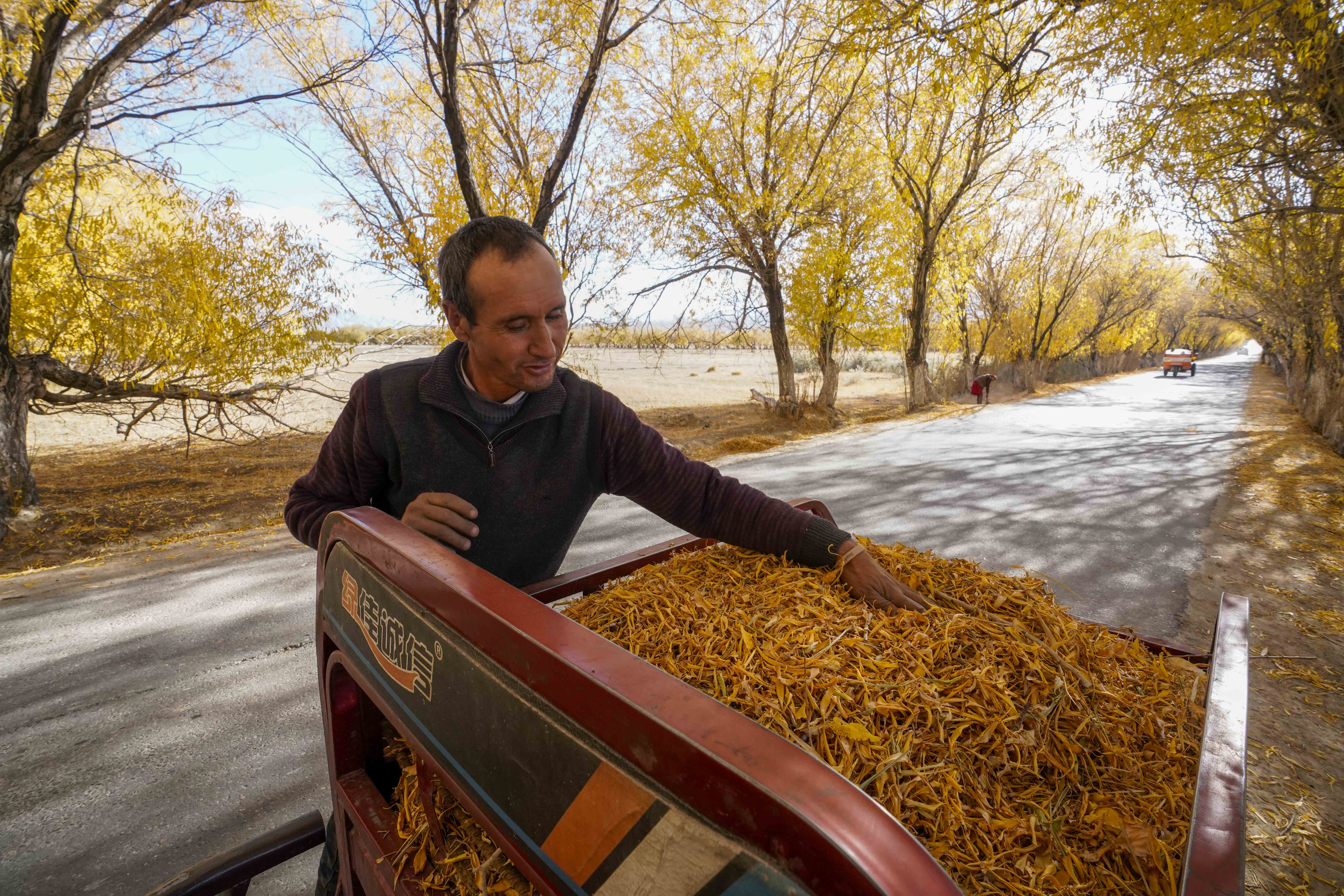 10月16日,在新疆塔什库尔干塔吉克自治县塔合曼乡,村民清理道路两旁的落叶。