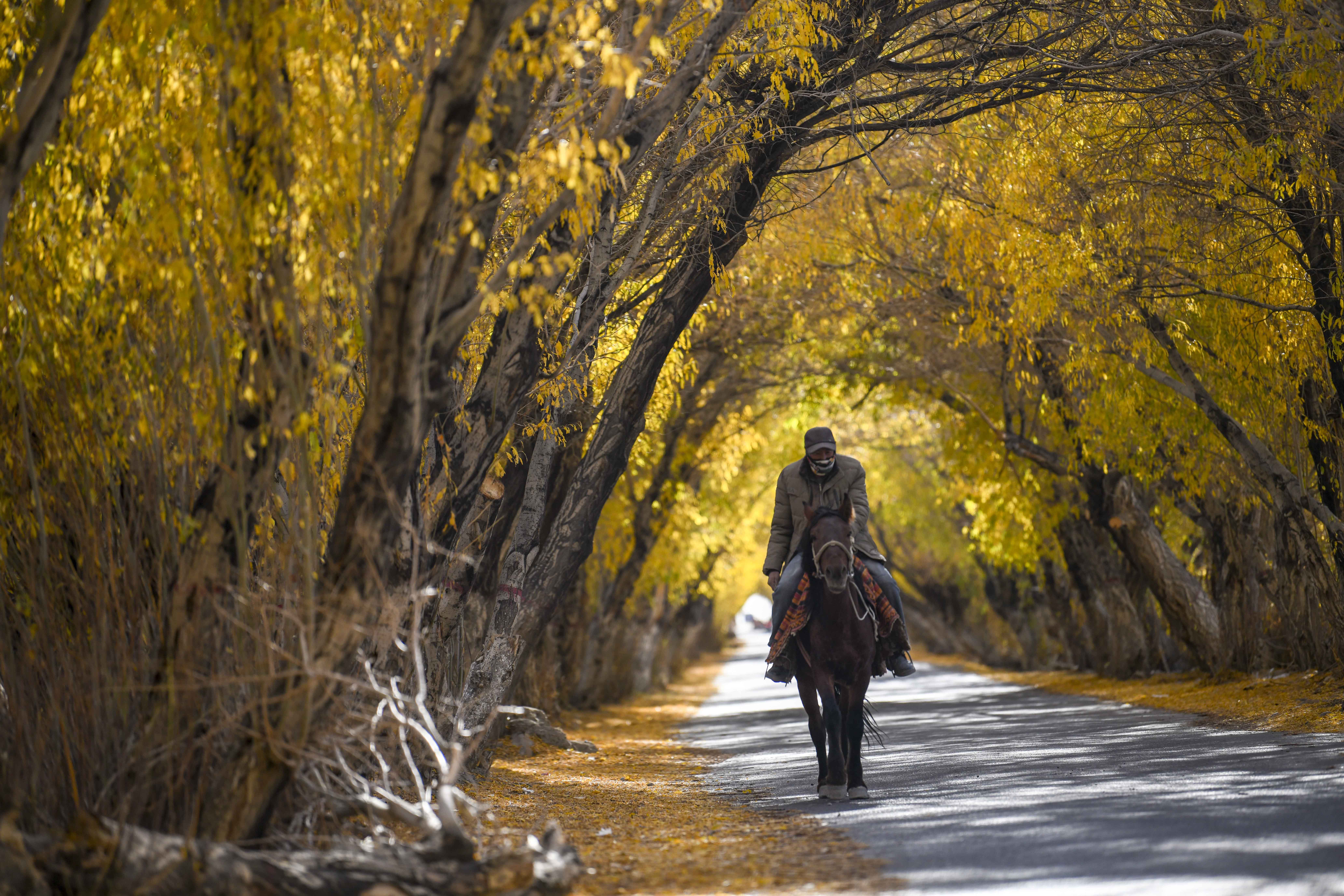 10月16日,在新疆塔什库尔干塔吉克自治县塔合曼乡,当地村民骑马走在一条乡间道路上。