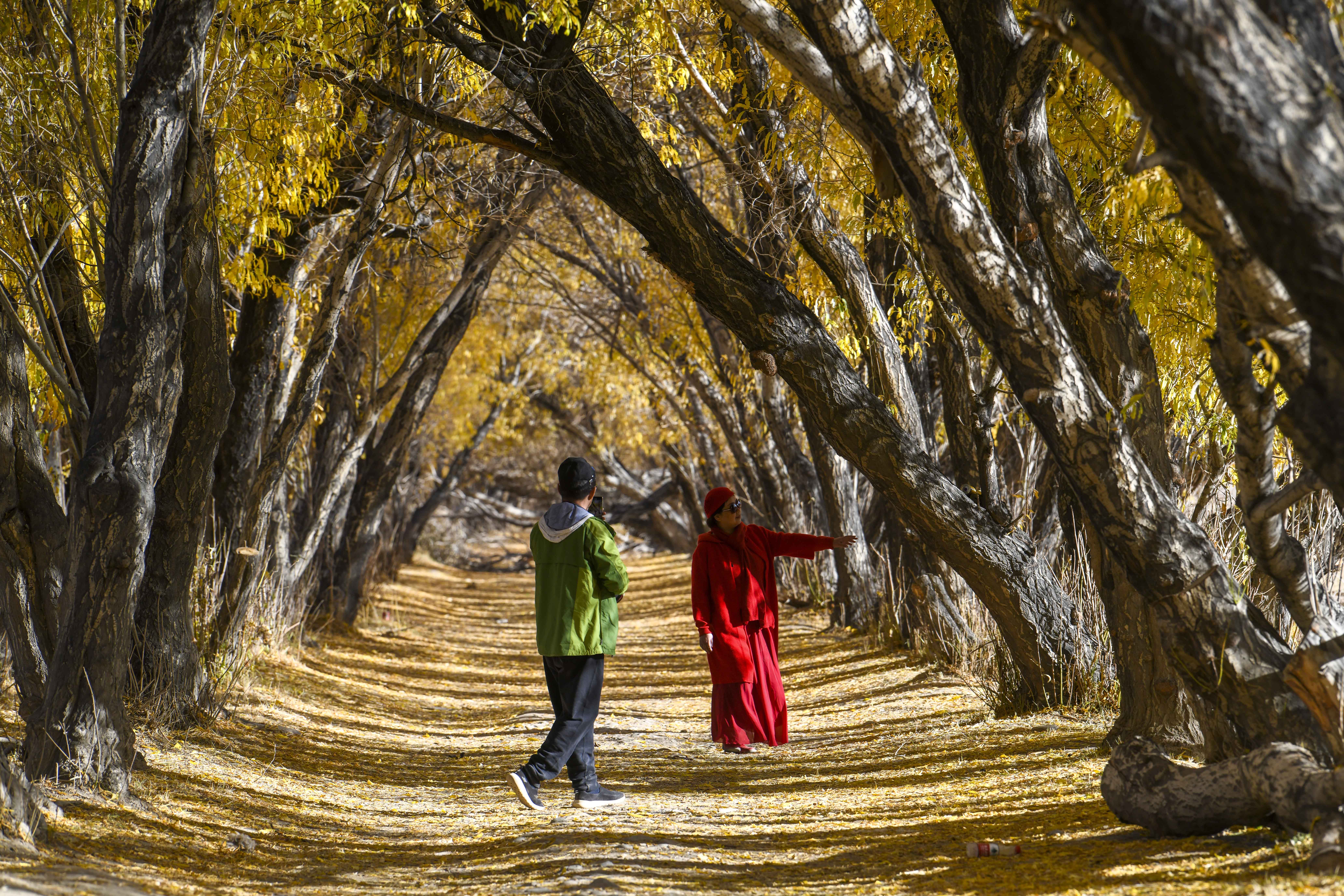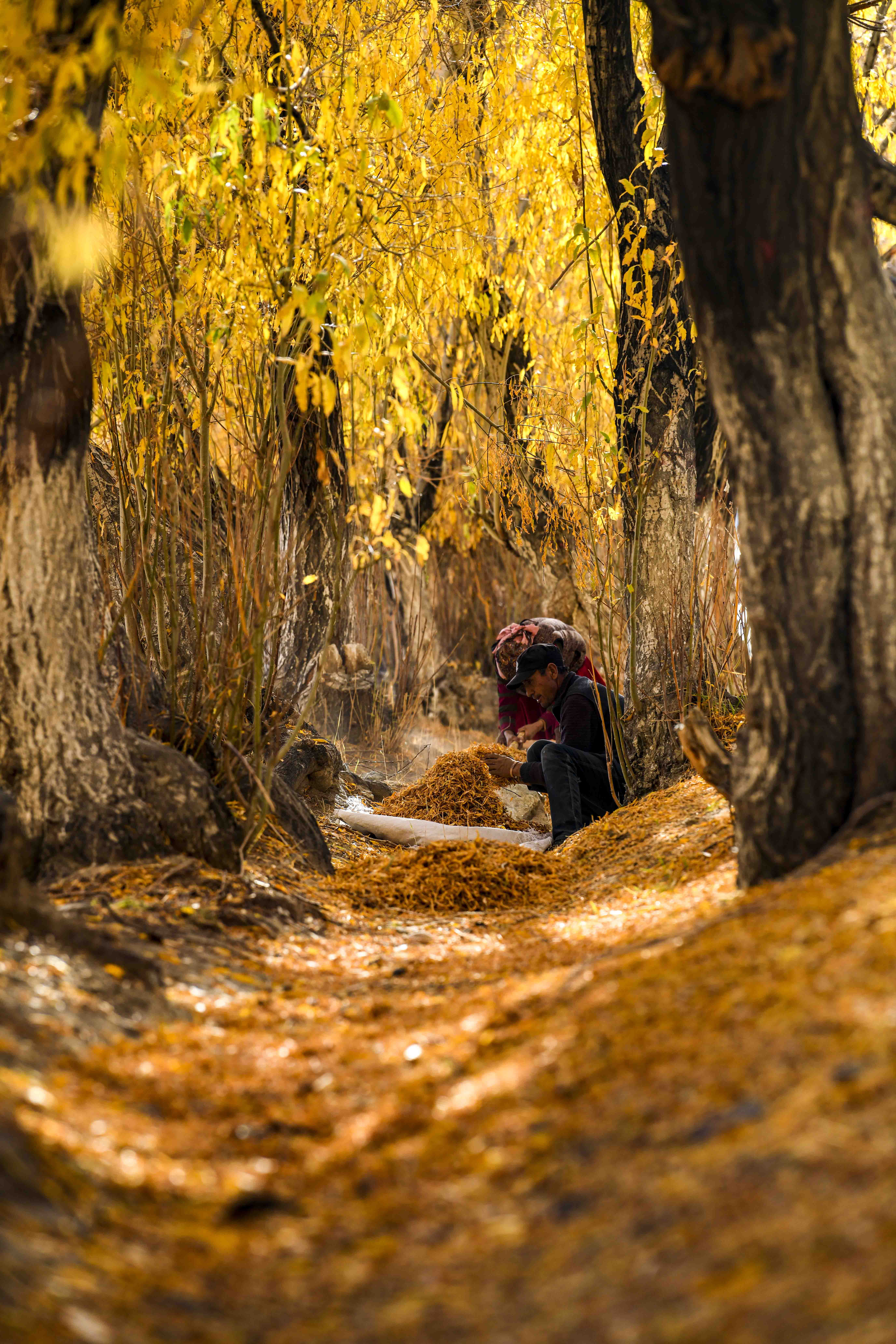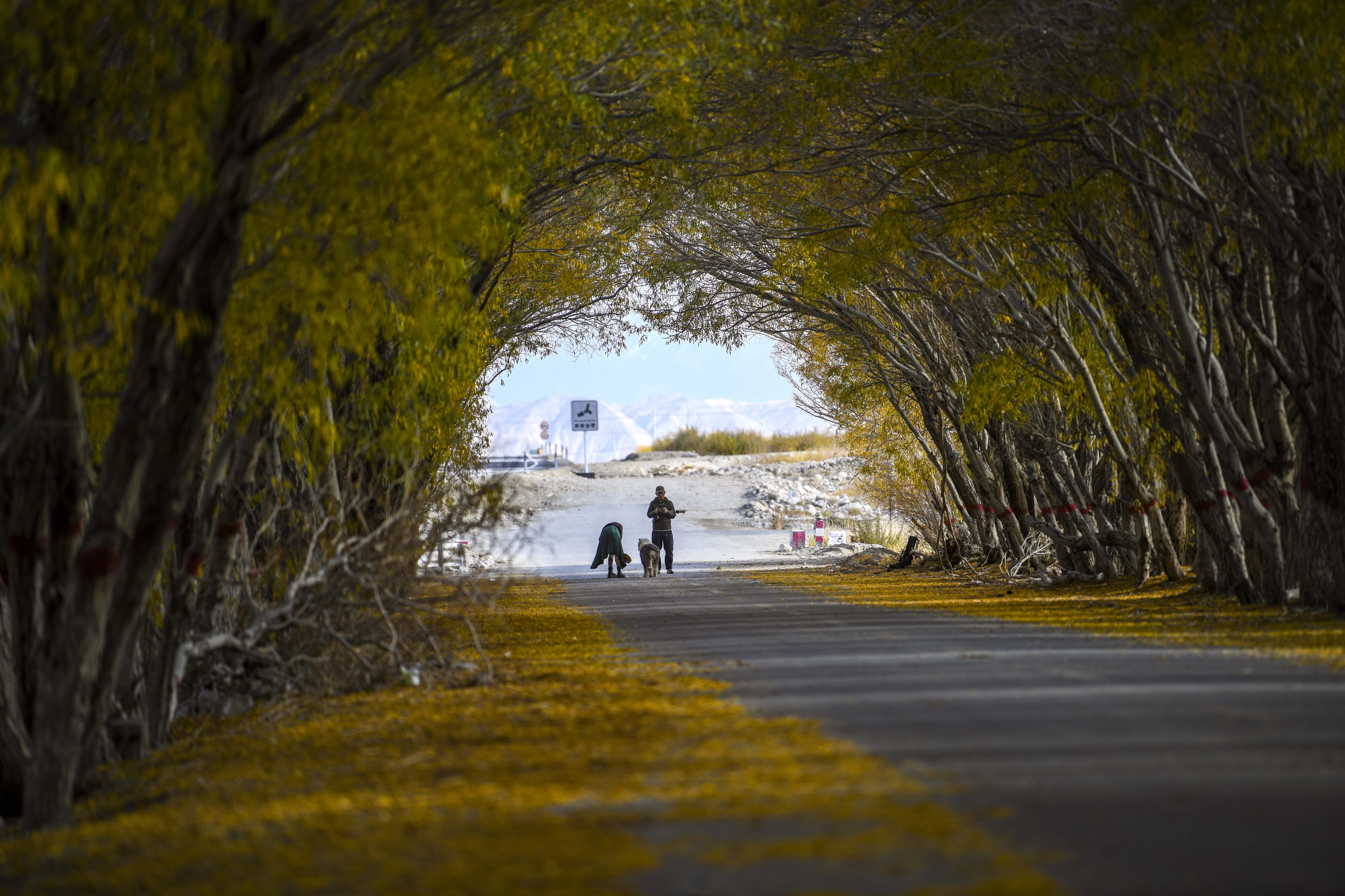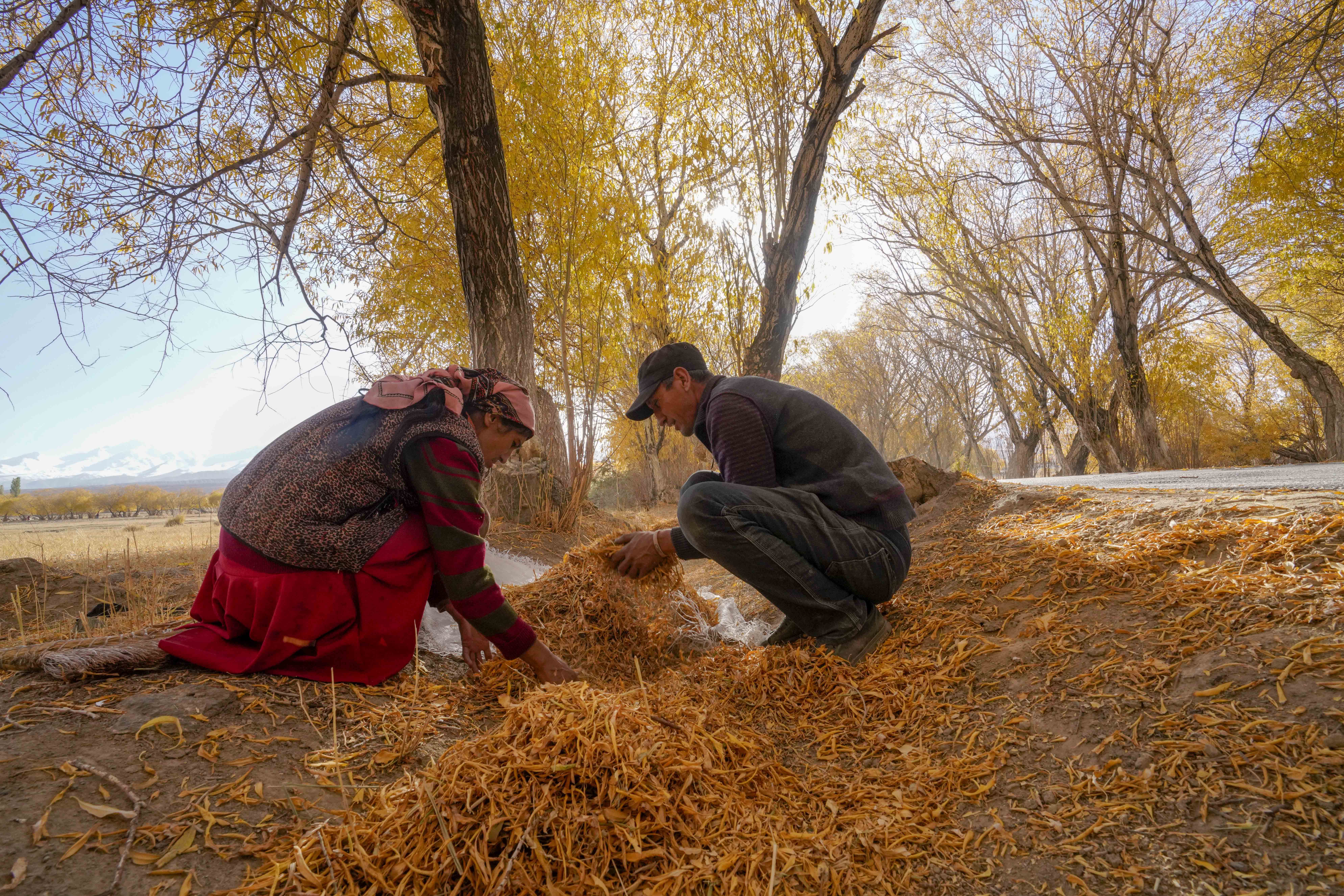 10月16日,在新疆塔什库尔干塔吉克自治县塔合曼乡,两位村民在清理道路两旁的落叶。