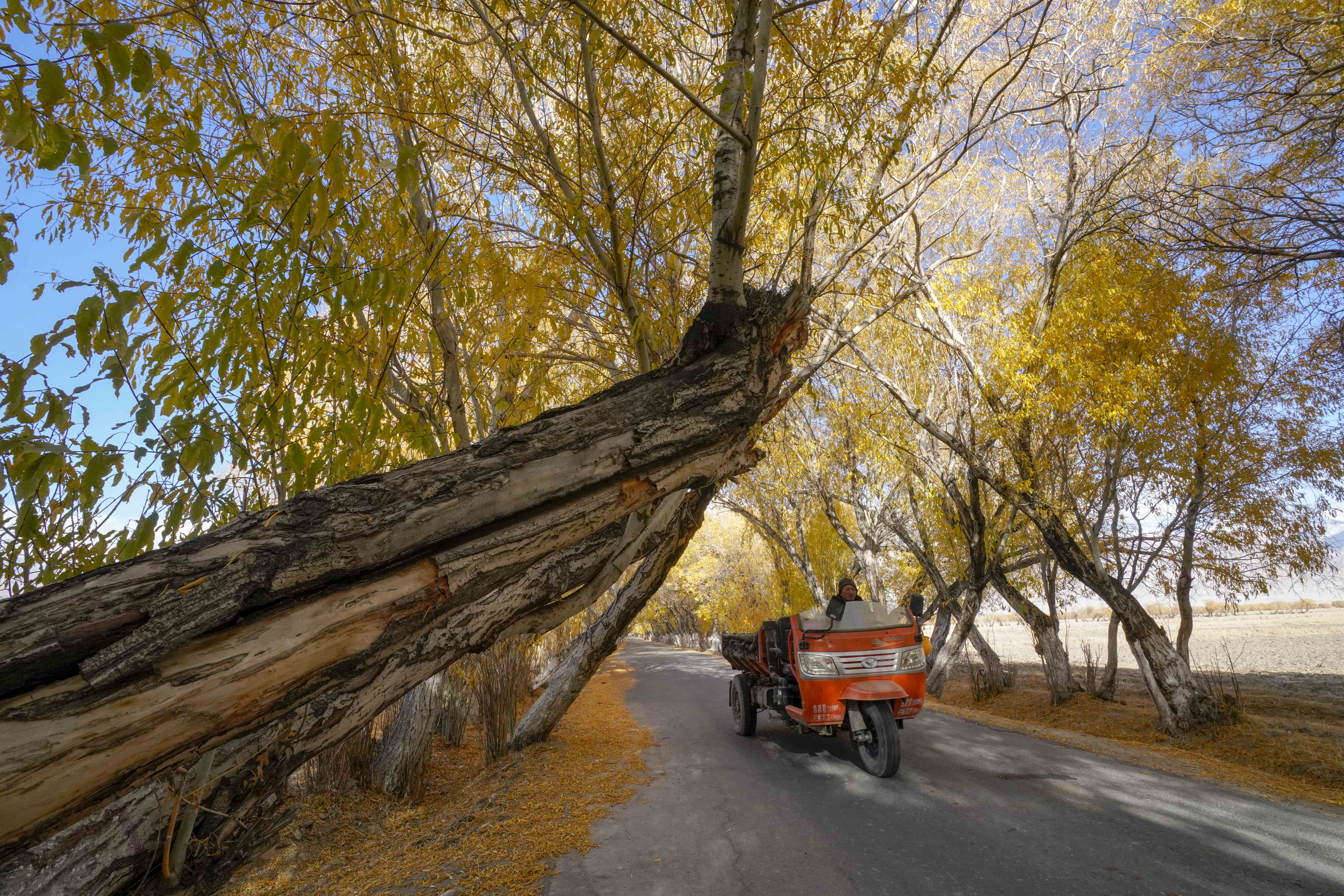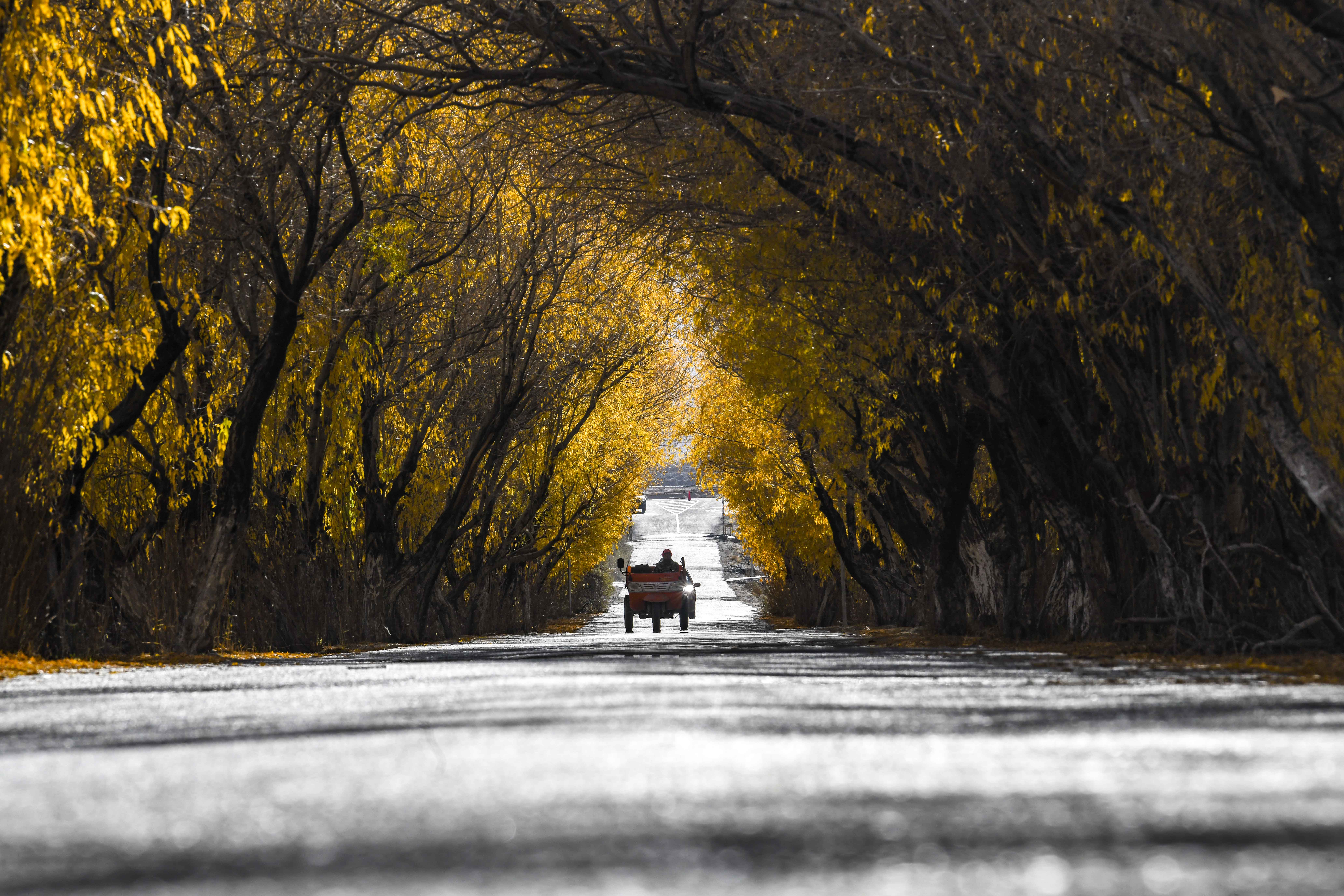 10月16日,在新疆塔什库尔干塔吉克自治县塔合曼乡,村民驾驶三轮车行驶在乡间道路上。