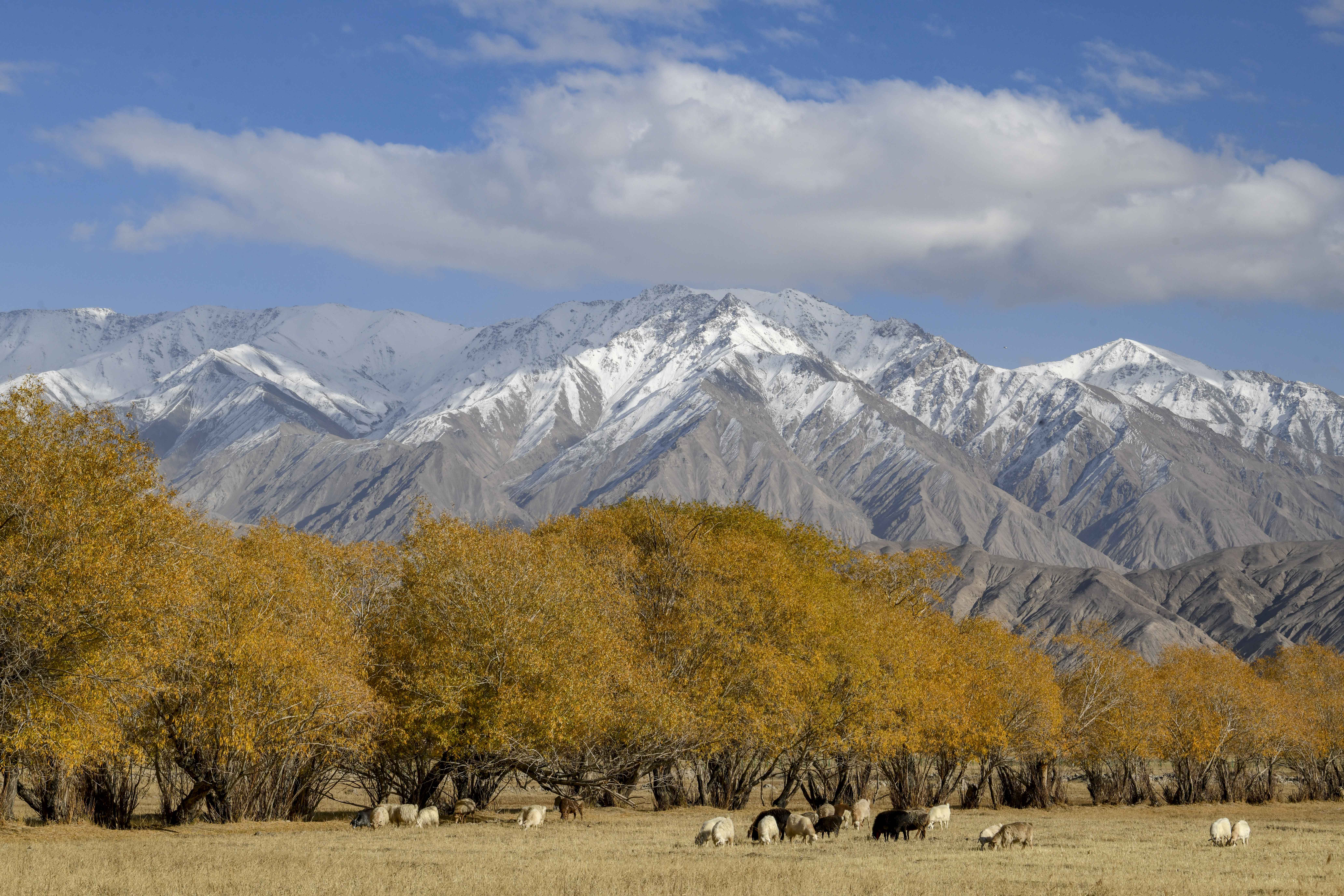 10月16日,在新疆塔什库尔干塔吉克自治县塔合曼乡,牛羊在草地上吃草。