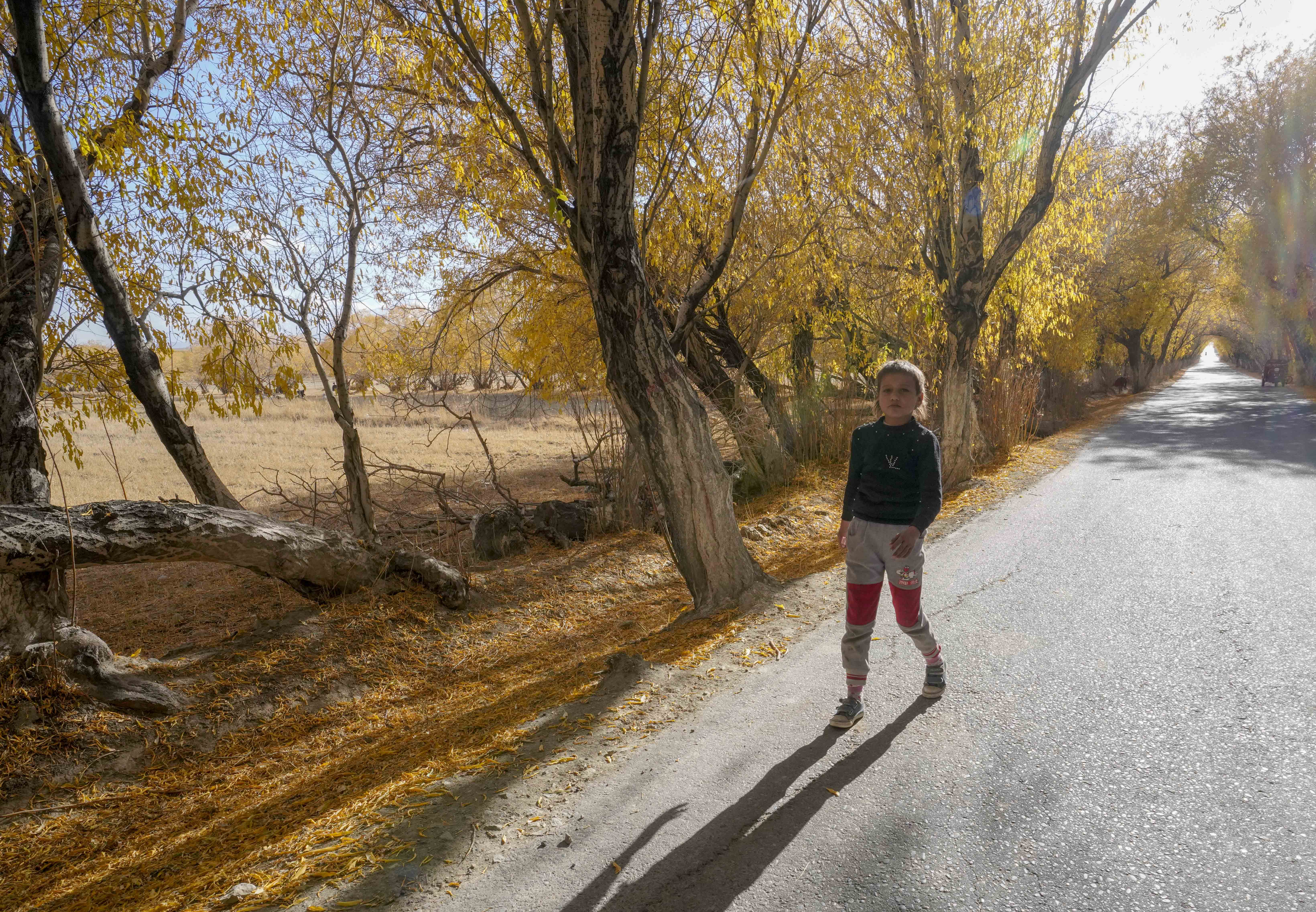 10月16日,在新疆塔什库尔干塔吉克自治县塔合曼乡,一名小朋友行走乡间道路上。