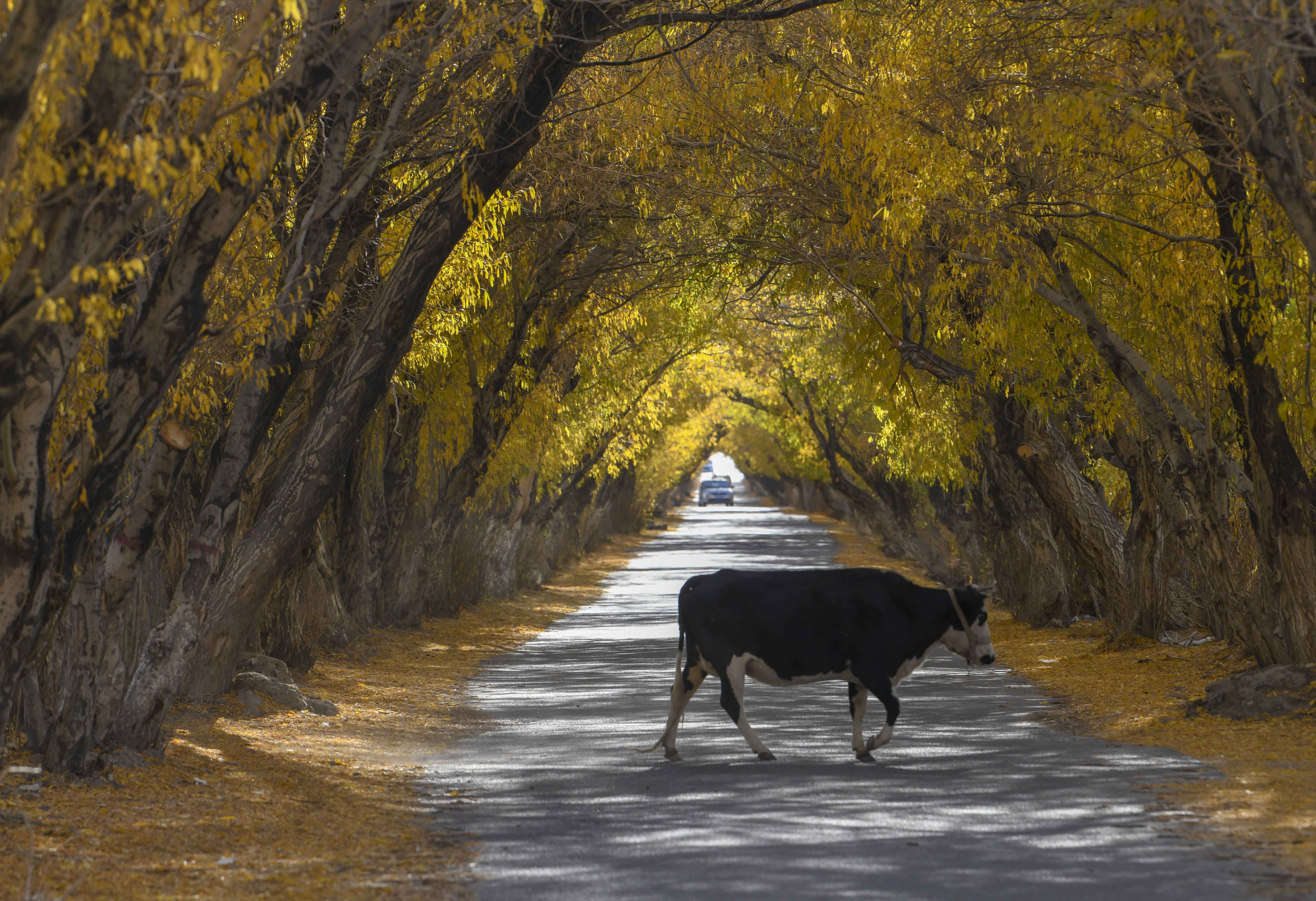 10月16日,在新疆塔什库尔干塔吉克自治县塔合曼乡,一头牛漫步在乡间道路上。