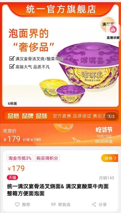 统一则推出汤达人升级版本“极味馆”,6杯整箱价格59.9元;“满汉大餐”系列价格则“更上一层楼”,2碗39.8元,“满汉宴”骨汤叉烧面6碗179元。