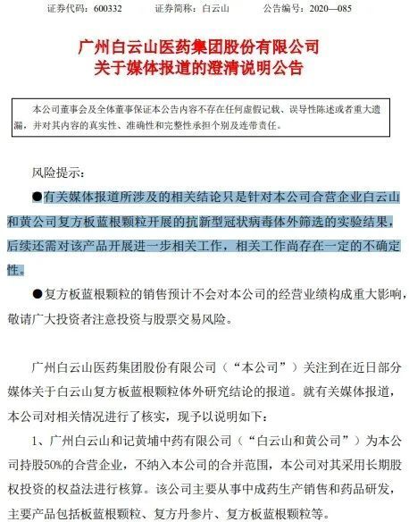 公告表示,有关媒体报道所涉及的相关结论只是钟南山院士团队针对白云山和黄公司复方板蓝根颗粒开展的抗新冠病毒体外筛选的实验结果,后续还需对该产品开展进一步相关工作,且相关工作尚存在一定的不确定性。