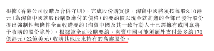 值得注意的是,根据《香港公司收购及合并守则》,在完成上述股份购买后,淘宝中国还须按每股8.10港元的要约价以现金就高鑫零售的全部已发行股份提出强制性无条件全面收购要约。淘宝中国可能要额外支付最多约170亿港元(22亿美元)收购其他股东持有的高鑫零售股份。