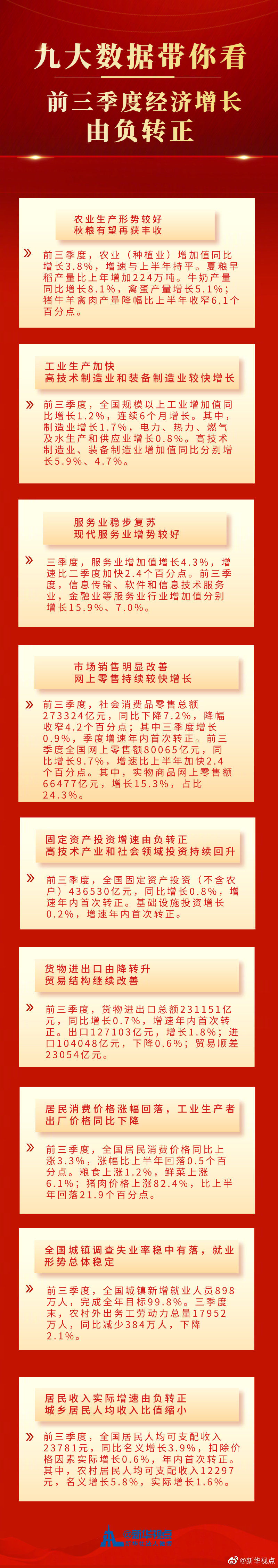 【一图速览!前三季度中国经济九大数据】国家统计局10月19日发布数据显示,前三季度国内生产总值722786亿元,同比增长0.7%,经济增速由负转正。农业生产形势较好,工业生产加快,服务业稳步复苏、城镇调查失业率稳中有落……一图带你看前三季度中国经济九大数据!