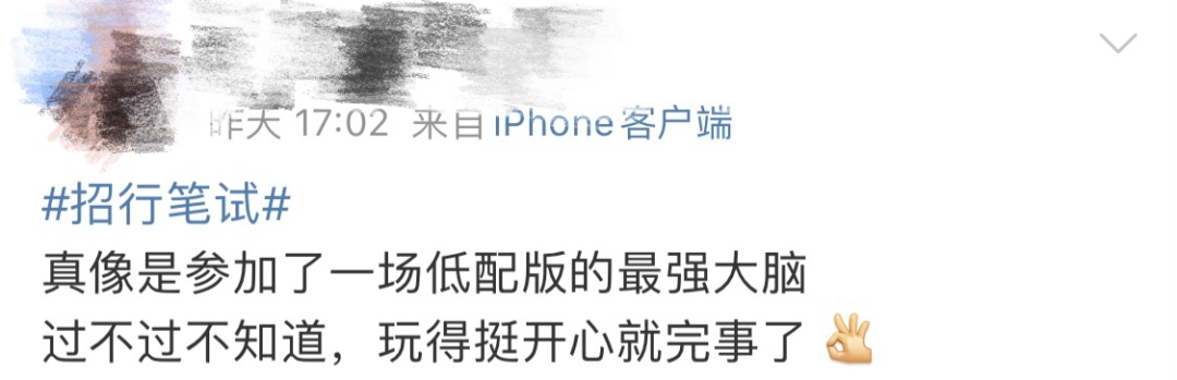第一棒——中行通过“无奇不有、惨绝人寰”的考题范围给此次接力赛开了一个“好头”;第二棒——交行另辟蹊径,靠着系统频频崩溃接力热搜;接下来两棒——农行和工行采取类似中行的战术,以奇葩的考题成功拿下热搜;第五棒——建行也因系统崩溃顺利拿下接力棒;目前最新的一棒——招行则“蹭着”最强大脑的流量成功登上热搜。
