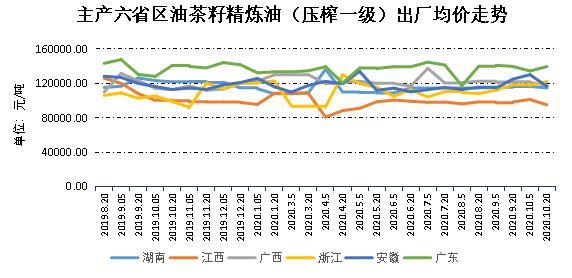 数据显示,截至2020年10月20日,10月上半月全国重点省区油茶生产加工企业油茶籽精炼油(压榨一级)出厂均价较9月下半月小幅下跌。其中浙江、广东两省重点企业油茶籽精炼油(压榨一级)出厂均价较9月下半月小幅上涨;湖南、江西、广西三个省区重点企业油茶籽精炼油(压榨一级)出厂均价较9月下半月小幅下跌;安徽省重点企业油茶籽精炼油(压榨一级)出厂均价较9月下半月跌幅较大,为10.51%。