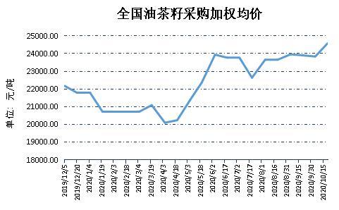 从全国市场看,油茶籽市场库存较少,供应紧俏,含油率在25%以上的油茶籽价格出现上涨。含油率在25%以上的油茶籽采购均价为24584.51元/吨,较上一统计日(2020年10月5日)23839.60元/吨上涨744.91元/吨,涨幅3.12%。