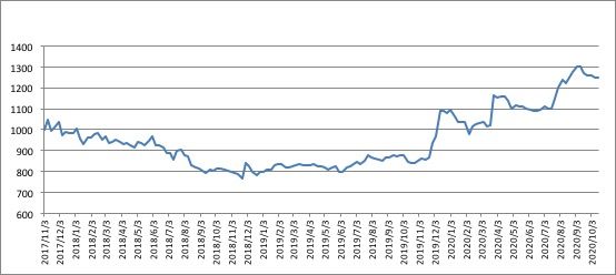10月16日,指数报1247.26点,较上期(2020.10.5-10.11,下同)下跌3.00点,跌幅0.24%,与基期相比上涨247.26点,涨幅24.73%。