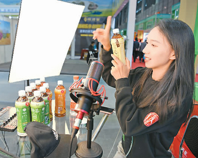 10月16日,在2020中国旅游产业博览会上,主播通过直播推介美食。宋 瑞摄(新华社发)