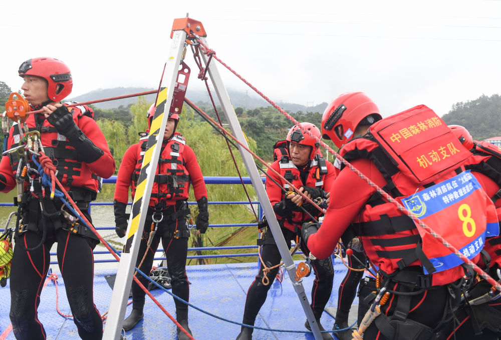 ↑福建森林消防总队队员在“河中沙洲救援”项目竞赛中。
