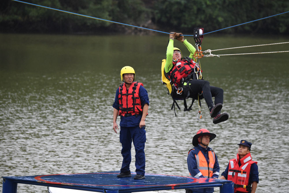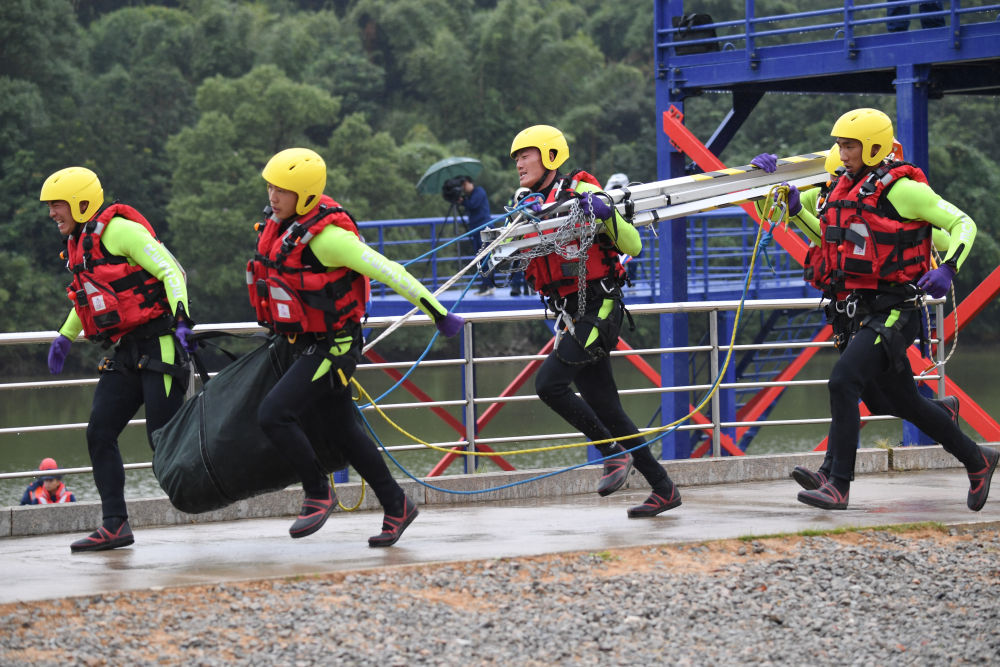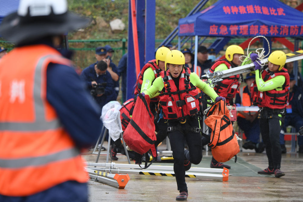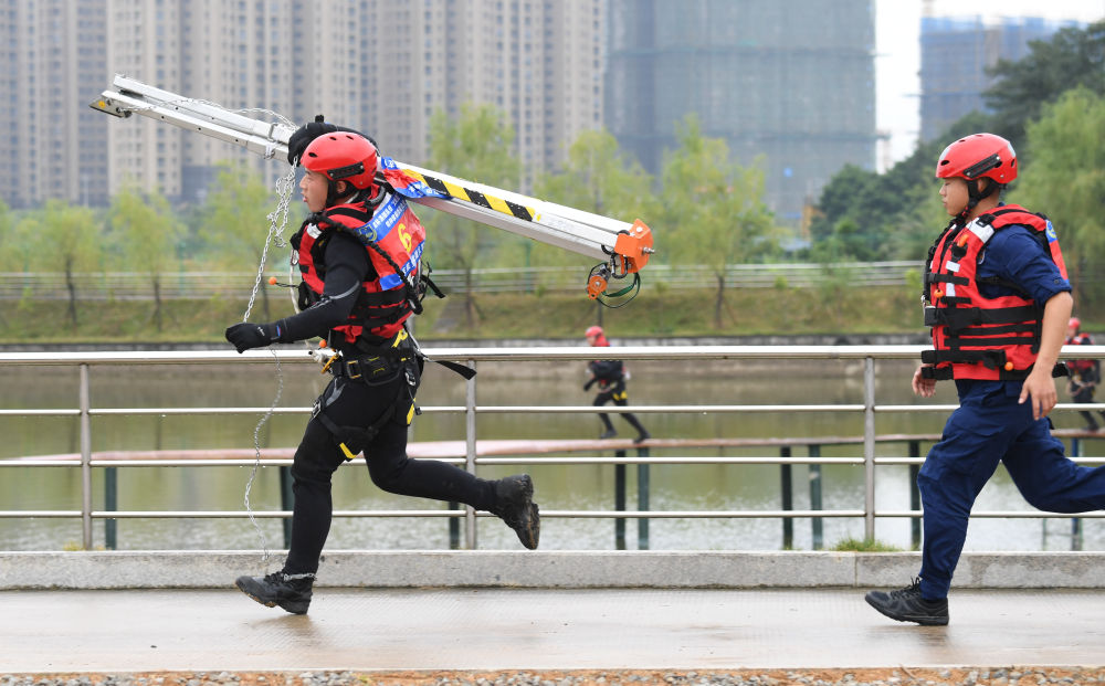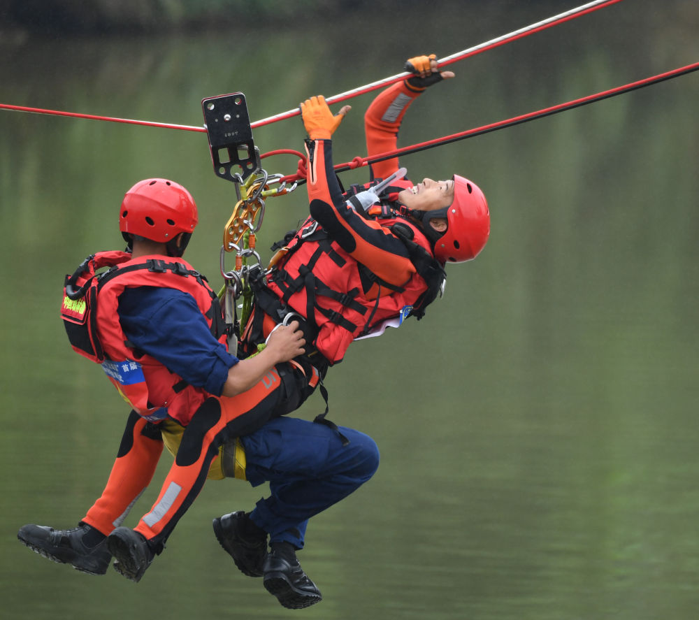 ↑四川森林消防总队队员参加“河中沙洲救援”项目竞赛。