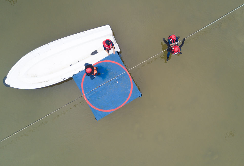 ↑大庆航空救援支队队员在“河中沙洲救援”项目竞赛中(无人机照片)。