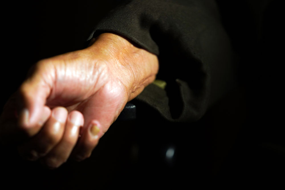 在黑龙江省牡丹江市,志愿军老战士庞兴海展示留有贯穿伤伤疤的右臂(9月23日摄)。新华社记者 王松 摄
