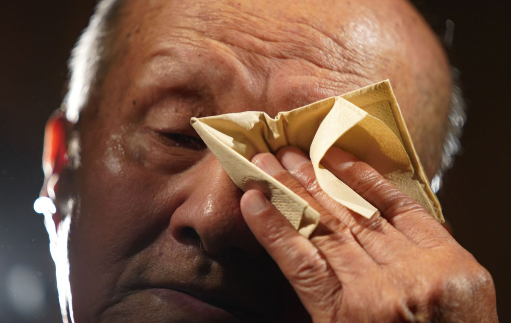 在黑龙江省牡丹江市,志愿军老战士庞兴海在回忆战争时流下眼泪(9月23日摄)。新华社记者 王松 摄