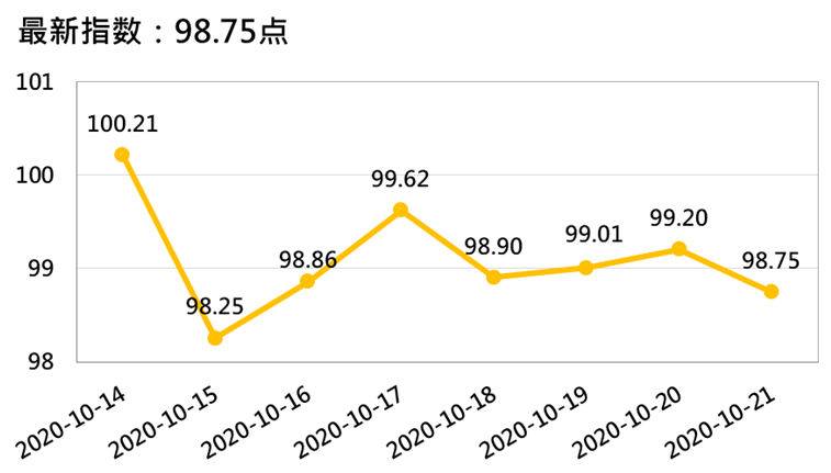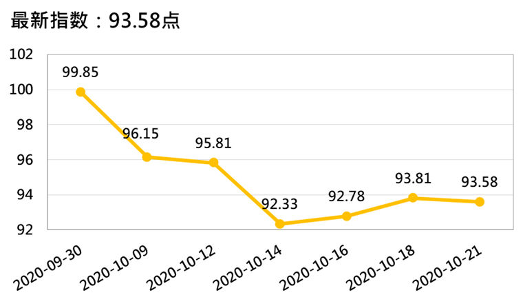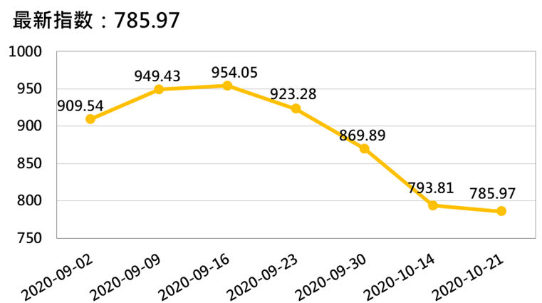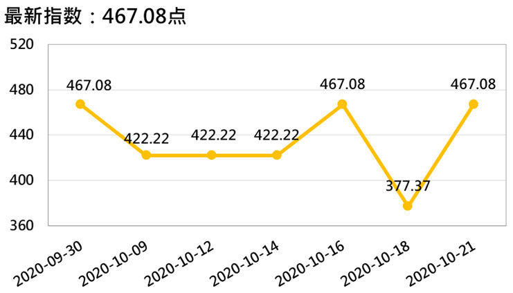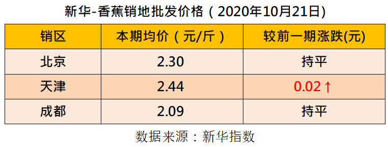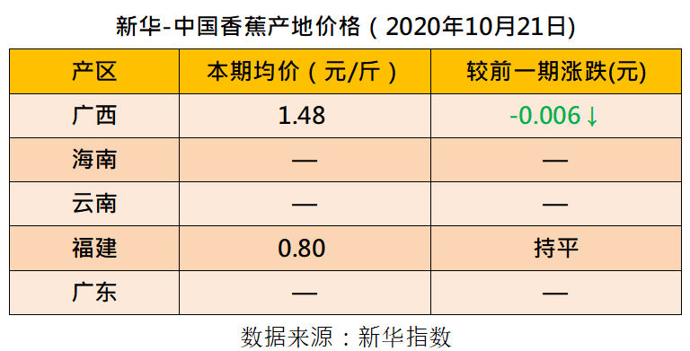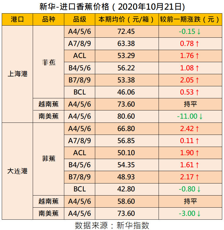 新华财经北京10月22日电(杨猛、李伯罧、汪伟坚)新华-中国香蕉产业四大指数显示,截至2020年10月21日,国内香蕉产地价格指数报93.58点,较上一发布日(2020年10月14日,下同)92.33点上涨1.35%;香蕉销地批发价格指数报98.75点,较上一发布日100.21点下跌1.46%;进口蕉价格指数报785.97点,较上一发布日793.81点下跌0.99%;皇帝蕉产地价格指数报467.08点,较上一发布日422.22点上涨10.62%。