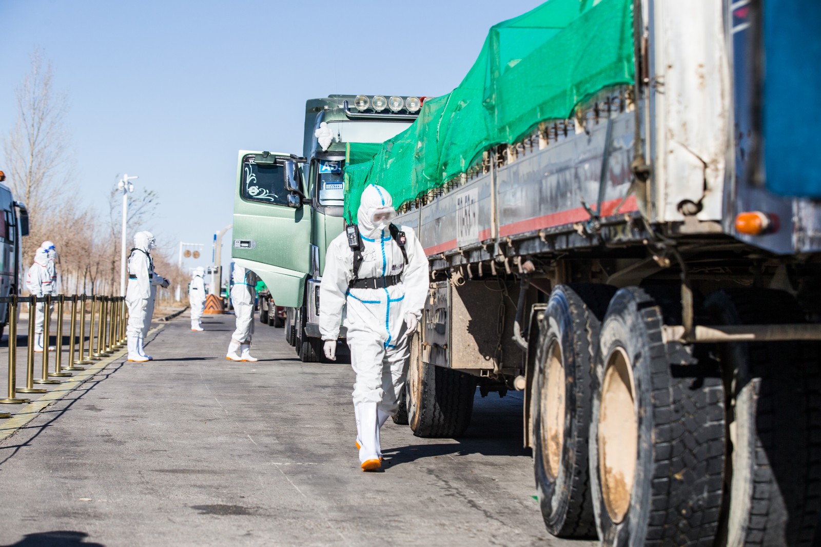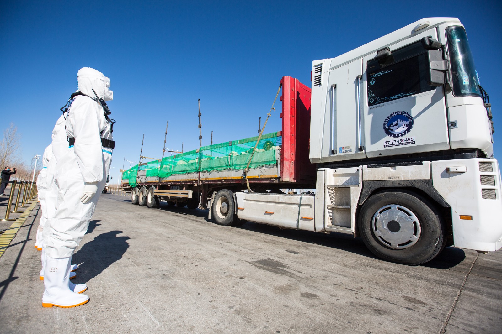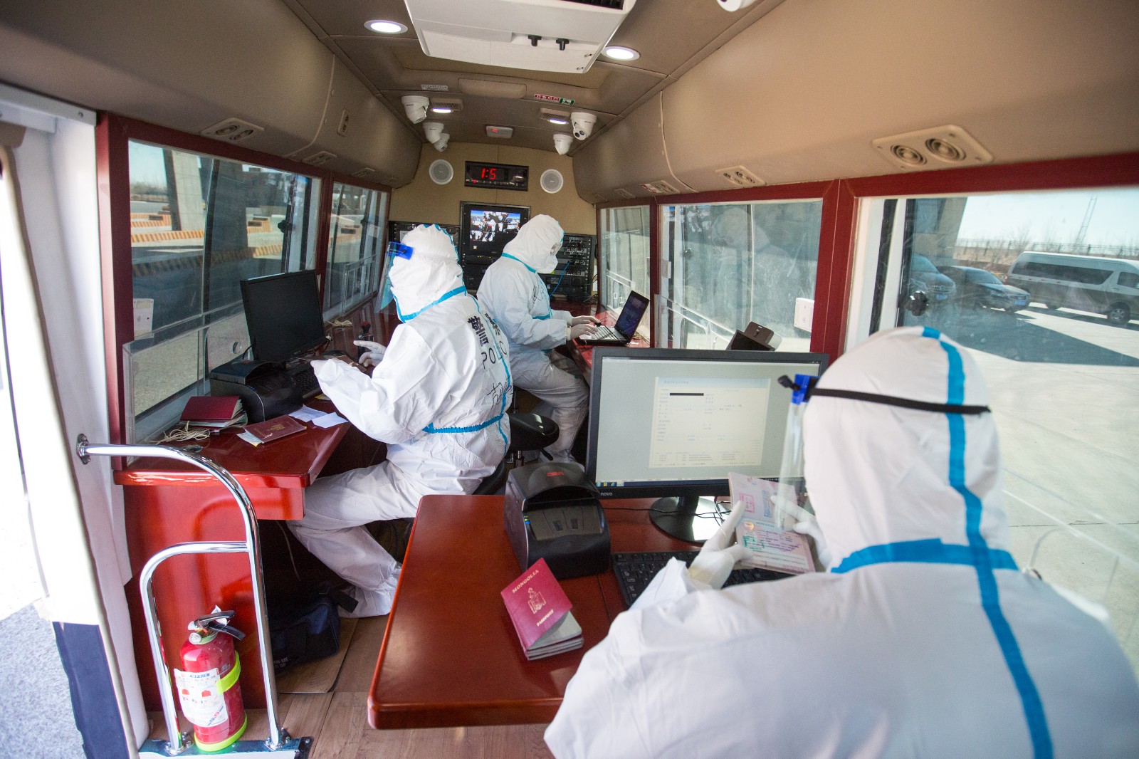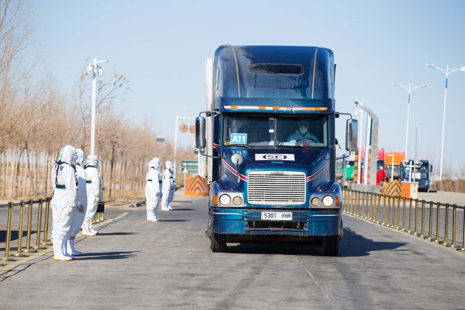 目前,蒙古向中国捐赠的3万只羊均已进入蒙古扎门乌德免疫无疫区进行隔离。根据中蒙双方商定的计划,3万只羊将分批于11月中旬前运抵中国境内,在二连浩特加工后运往湖北省,以把蒙古政府和人民的心意传递给在抗击疫情中作出巨大贡献的湖北人民。图为二连出入境边防检查站执勤民警查验蒙古国司机通关证件。 郭鹏杰摄
