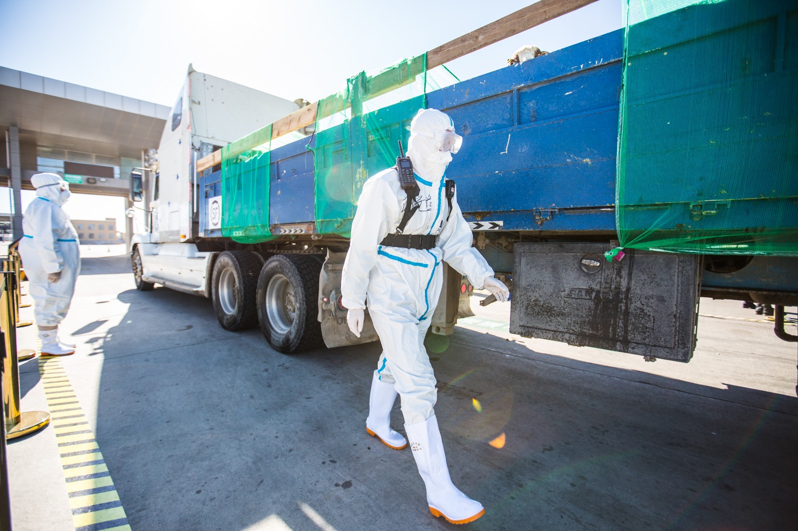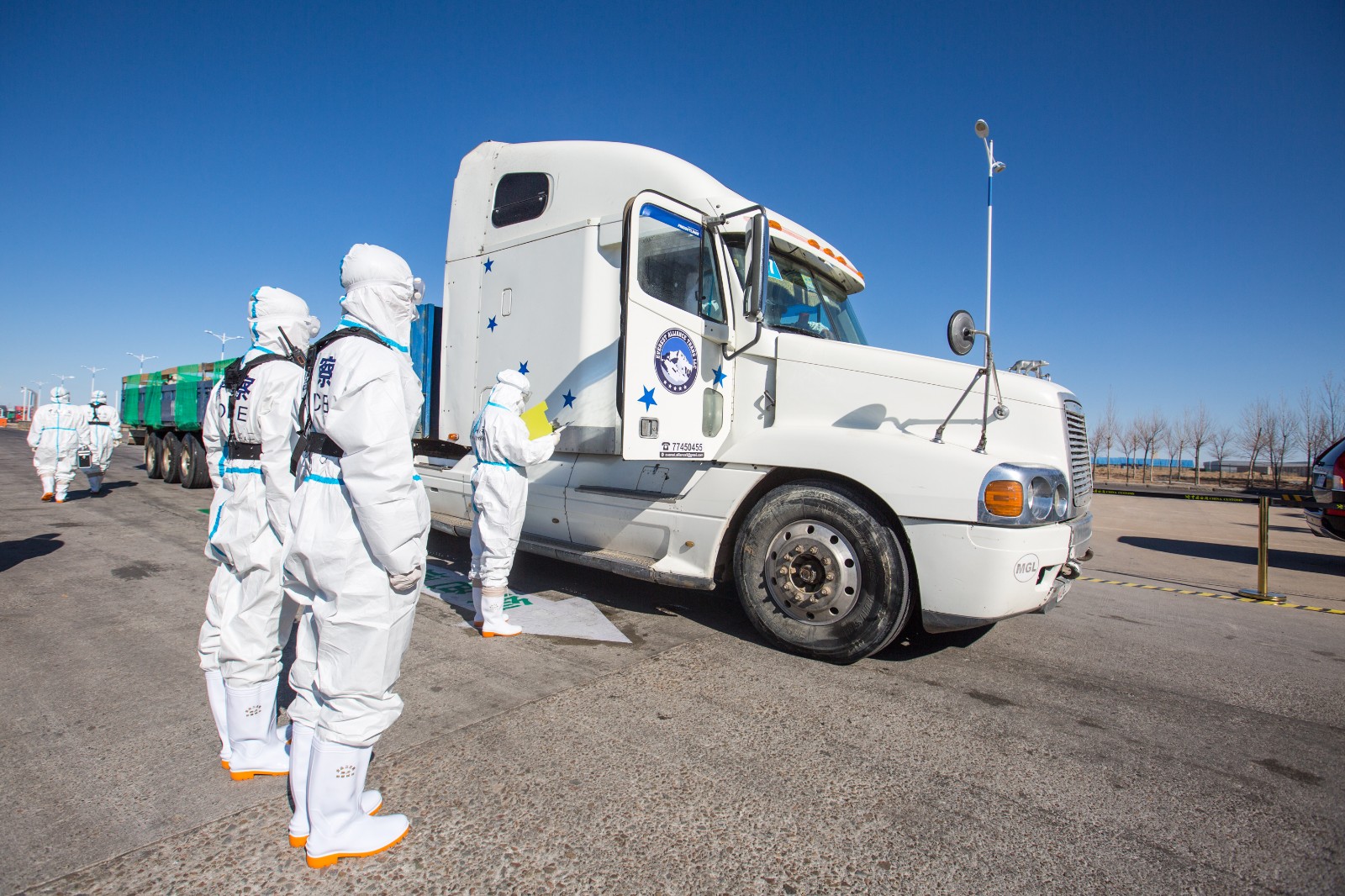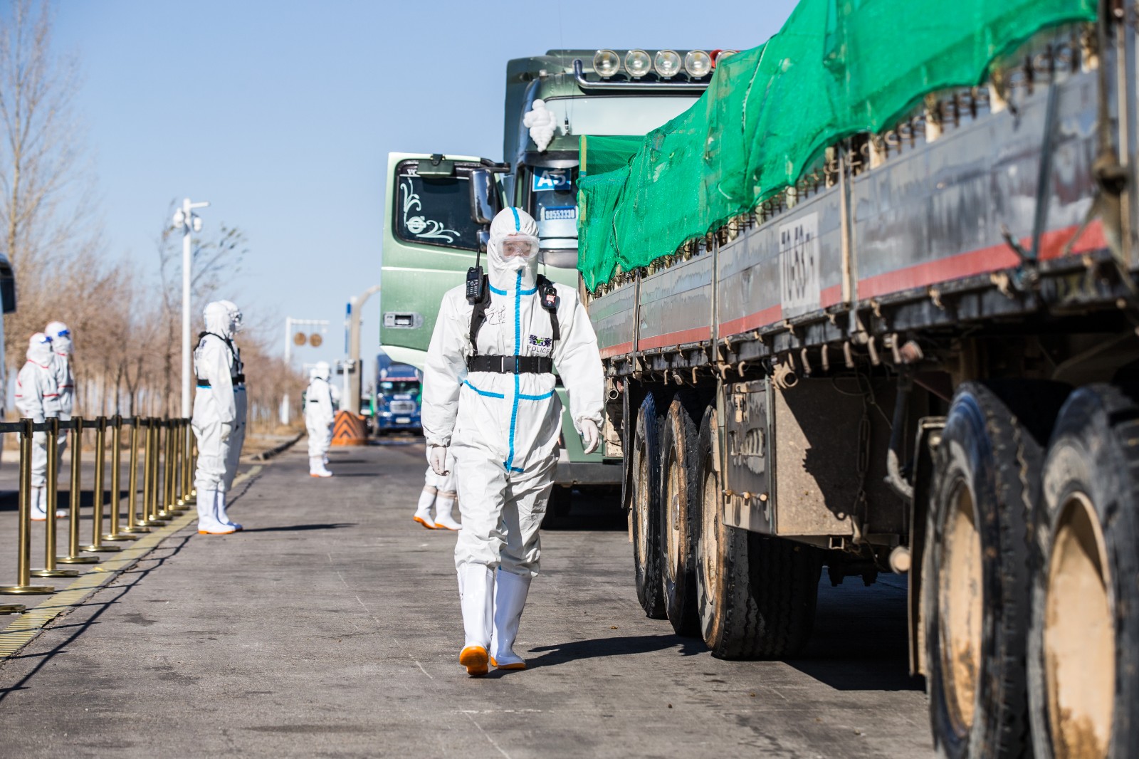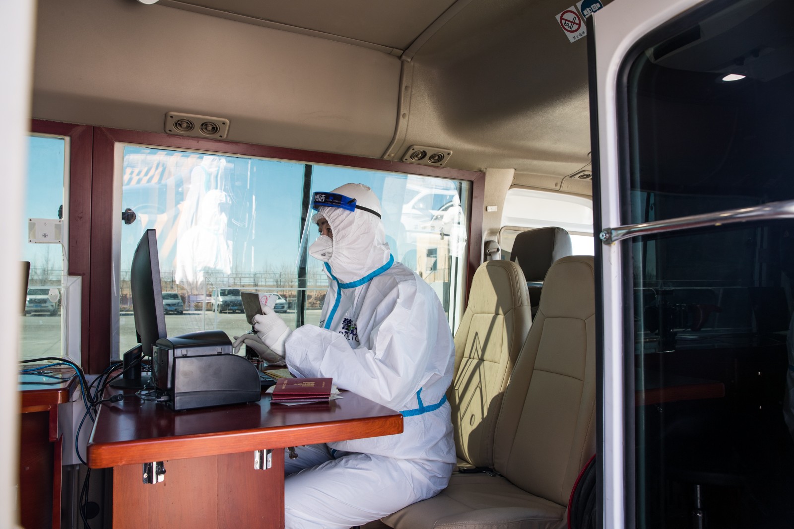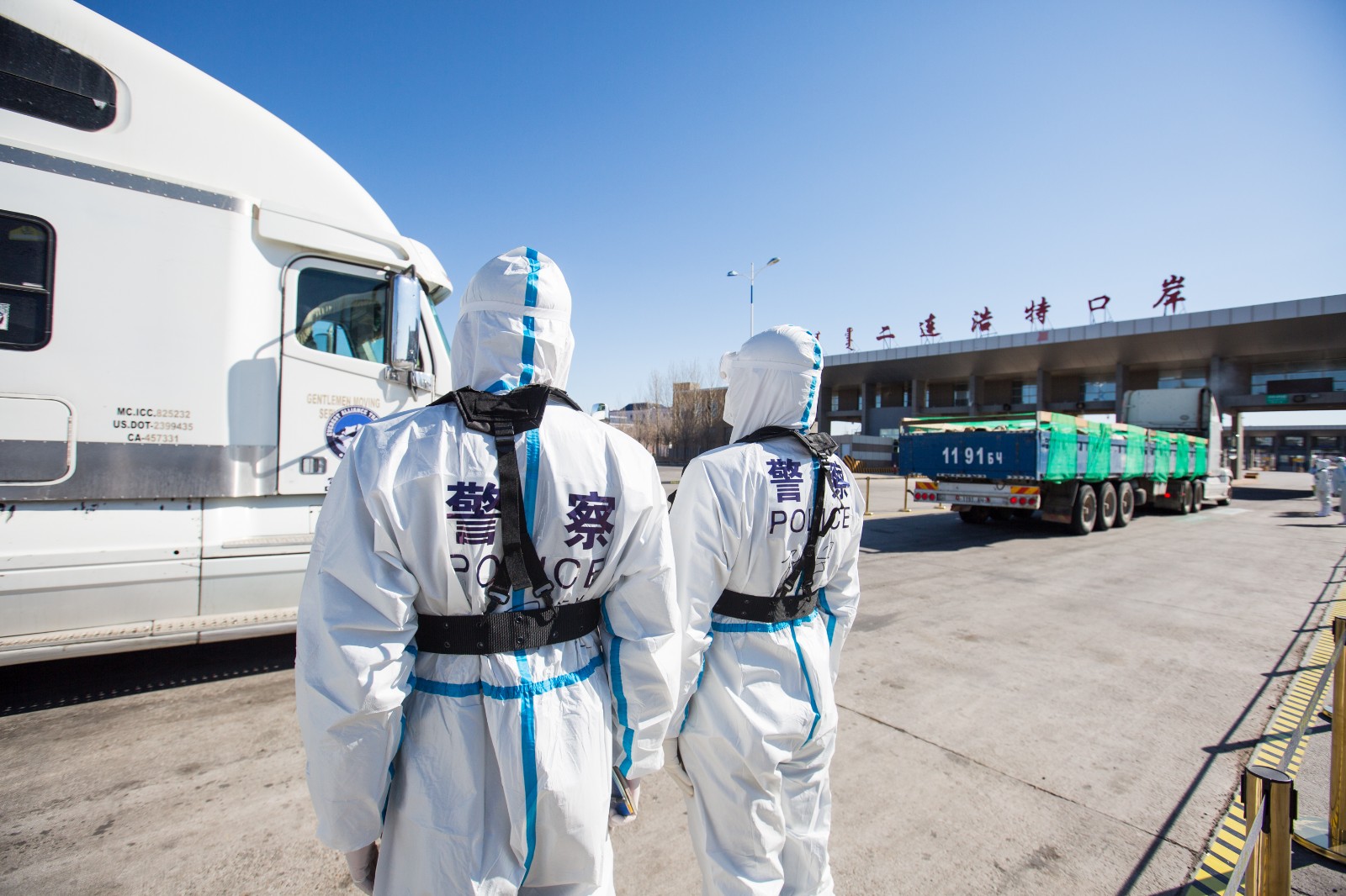 目前,蒙古向中国捐赠的3万只羊均已进入蒙古扎门乌德免疫无疫区进行隔离。根据中蒙双方商定的计划,3万只羊将分批于11月中旬前运抵中国境内,在二连浩特加工后运往湖北省,以把蒙古政府和人民的心意传递给在抗击疫情中作出巨大贡献的湖北人民。图为二连出入境边防检查站执勤民警查验蒙古国司机通关证件。 郭鹏杰摄