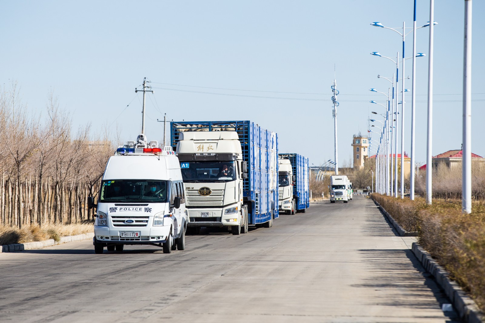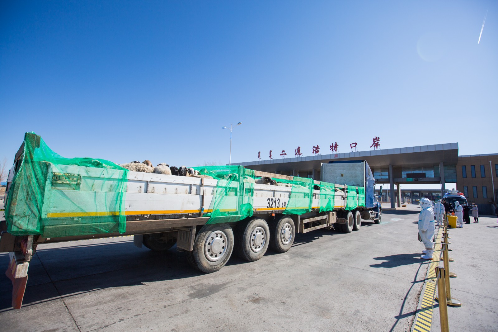 在中蒙双方紧密合作下,经过半年多精心筹备,蒙古为支持中国抗击新冠肺炎疫情而捐赠的3万只羊正式开始移交中方。10月22日,首批4000只蒙古捐赠羊经内蒙古二连浩特口岸入境中国,中蒙双方在确保防疫安全的前提下,在二连浩特—扎门乌德口岸举行交接仪式。(人民日报客户端内蒙古频道 张枨)图为10月22日,二连出入境边防检查站为载羊车辆开通绿色通道。郭鹏杰摄