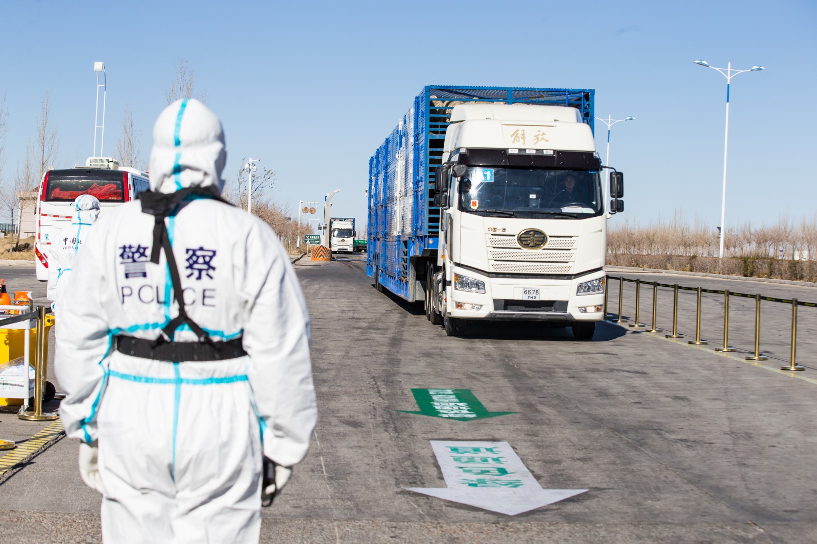 在二连浩特口岸入境通道,内蒙古出入境边防检查总站二连出入境边防检查站在做好疫情防控工作的同时,协同海关开通“绿色通道”,制定“一站式”通关勤务方案,加派警力加快车体验放速度,确保载羊车辆安全顺畅通关。此前,这些羊在蒙古国免疫无疫区进行了隔离。图为二连出入境边防检查站引导车辆安全有序通关。郭鹏杰摄