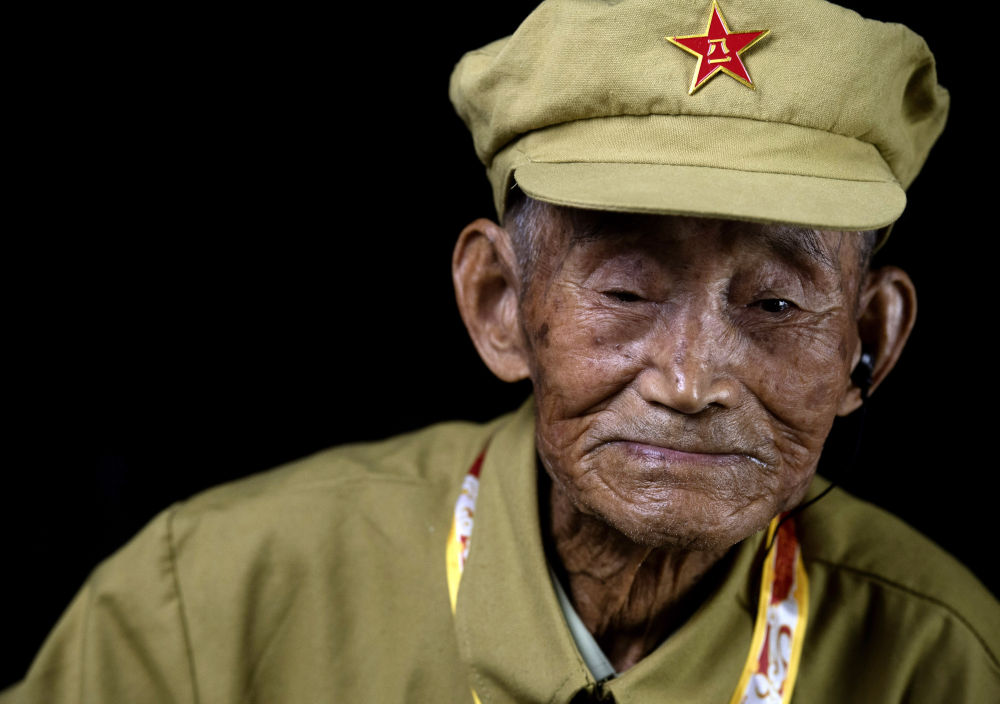 在天津市,志愿军老战士杨树柏回忆战争经历(9月23日摄)。新华社发(赵子硕 摄)