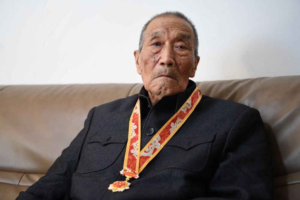 在河北省保定市拍摄的志愿军老战士王应邦(10月12日摄)。新华社记者 牟宇 摄 王应邦,1927年生,山西灵丘人,1951随部队入朝。在铁原阻击战中,王应邦在坑道中的指挥所维护通信线路,负伤后忍着剧痛继续抢修,完毕后才对伤口进行简单包扎,这次负伤导致他在手术后失去两根肋骨和半块肺叶。1952年,王应邦荣立一等功。