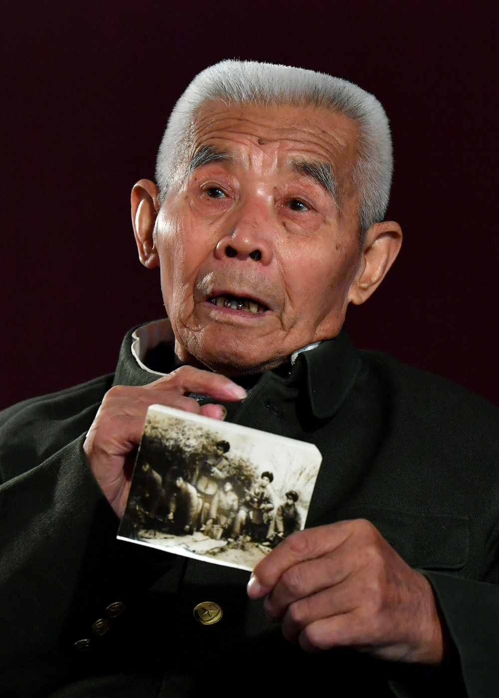 在陕西省西安市,志愿军老战士解永江展示他和战友的照片(10月10日摄)。新华社记者 刘潇 摄