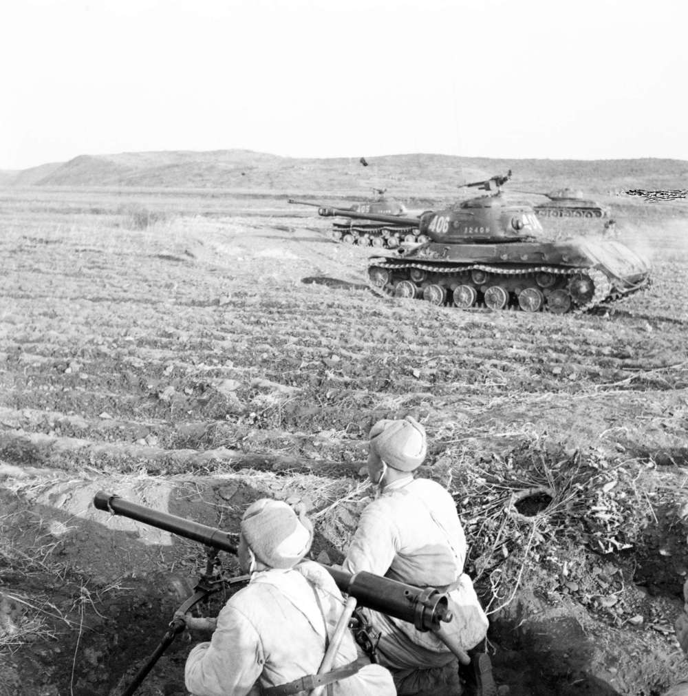 1952年3月17日,中国人民志愿军的火炮在战场上掩护坦克进攻。新华社记者 钱嗣杰 摄