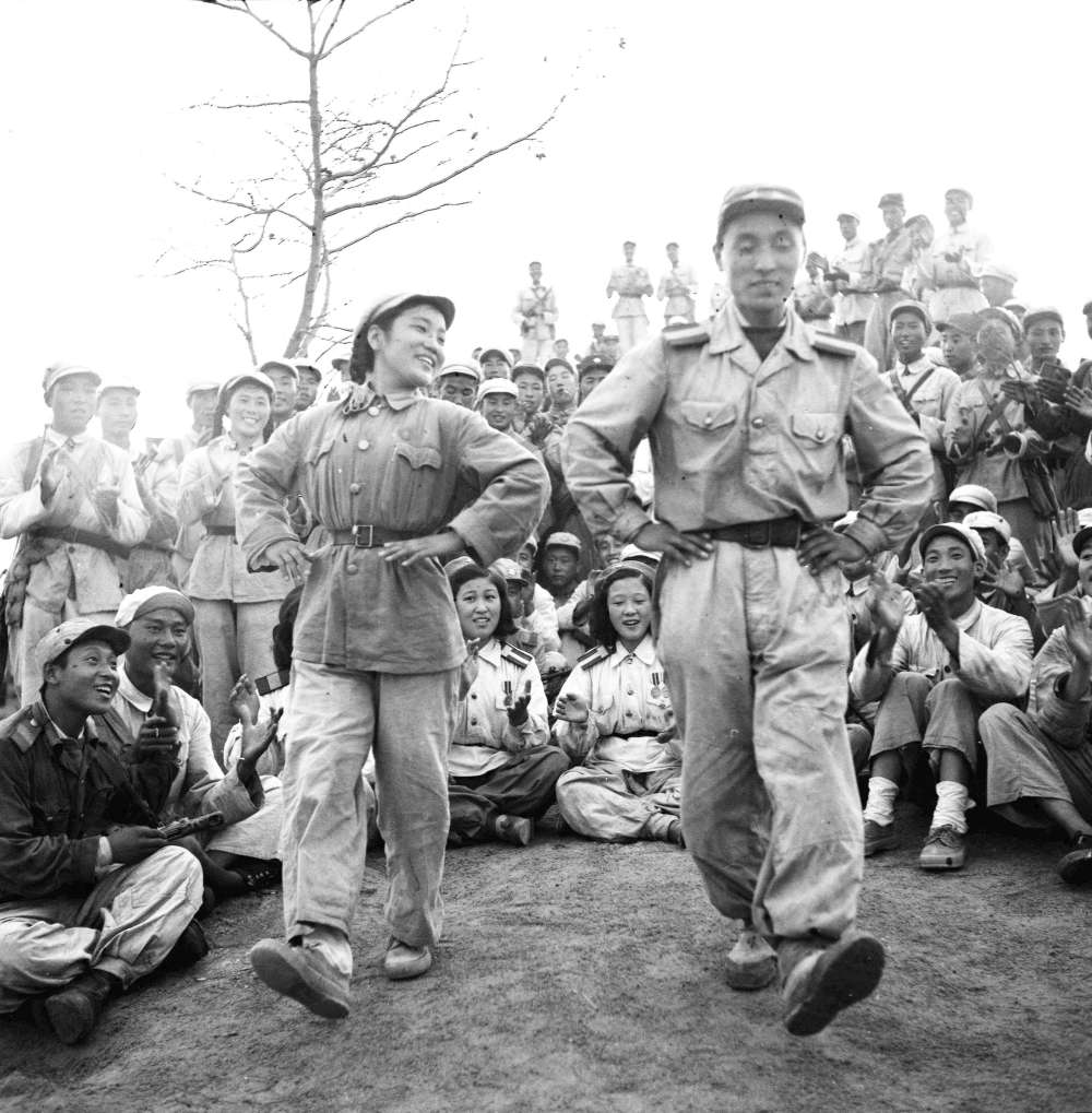 1952年8月31日,中国人民志愿军和朝鲜人民军在某阵地会师后举行联欢会。新华社记者 钱嗣杰 摄