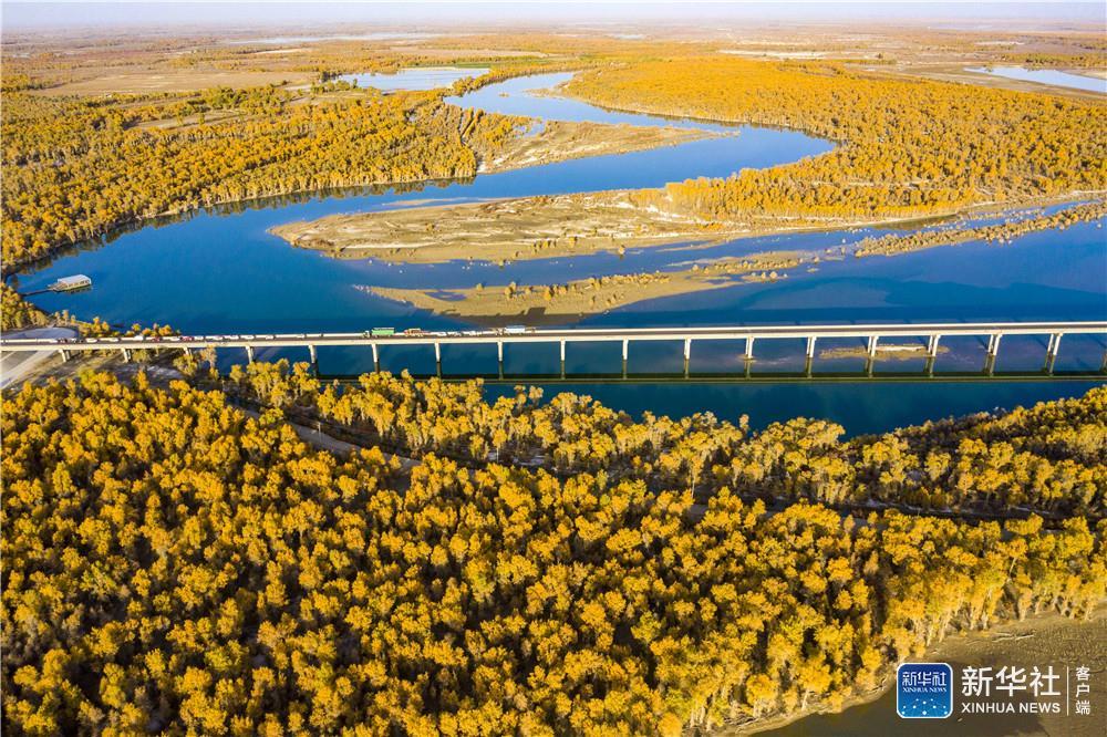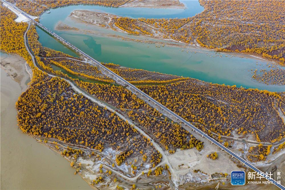 ↑新疆阿克苏地区沙雅县哈德墩大桥横跨塔里木河,穿过层林尽染的胡杨林区(10月22日摄,无人机照片)。新华社记者 胡虎虎 摄