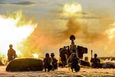 ▲2017年8月25日,第74集团军某炮兵旅在西北戈壁组织实兵实弹战术演习,“志愿军战歌连”对“敌”实施火力打击。新华社资料片