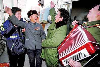 ▲2000年1月19日,当在河北省井陉矿区清泉村家中听到男高音歌唱家富立明演唱《中国人民志愿军战歌》时,曾赴朝参战的退伍军人路元风(左二)激动地站起来和演员齐声高唱。新华社资料片